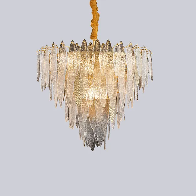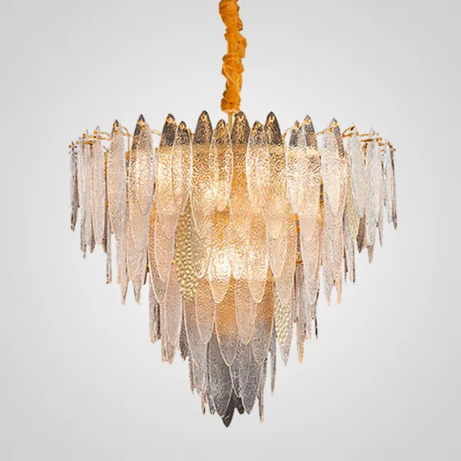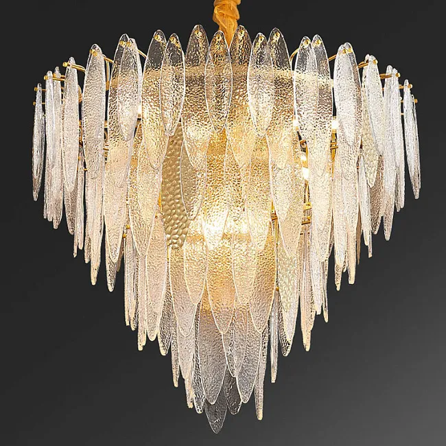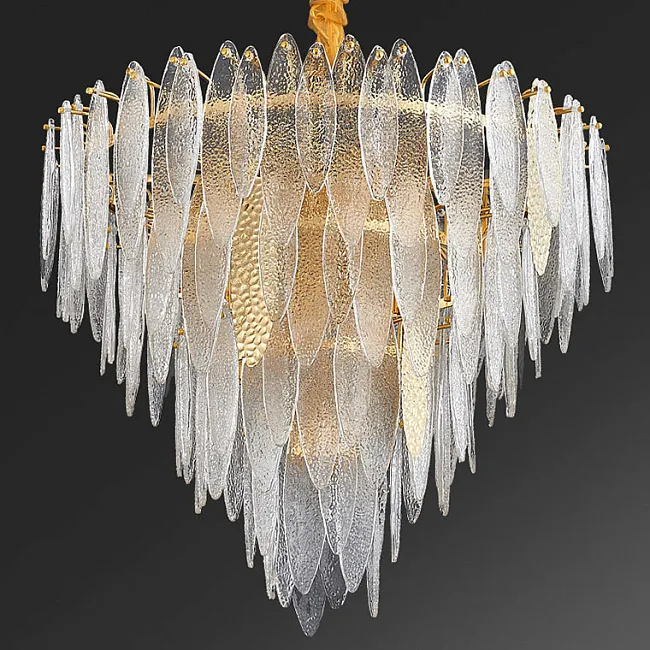 Кольцевая люстра со стеклянными прозрачными подвесками лепестками, голубыми и белыми вставками с фигурной поверхностью