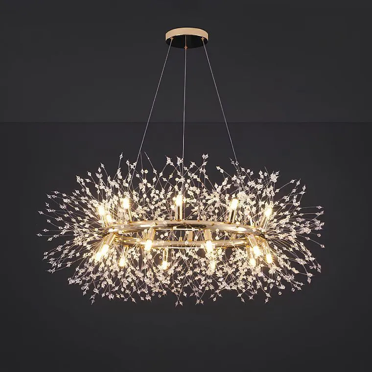 Представьте себе вечер, наполненный мягким светом, который словно нежный шепот окружает вас, создавая атмосферу уюта и изысканности. В центре этого света кольцевая люстра, словно облако из золотых нитей, увенчанное искрящимися пучками хрустальных бусин. Они играют с лучами света, рассыпая по комнате завораживающие искры, как капли росы на утреннем солнце. Нежные "брызги" хрусталя напоминают капли дождя, скользящие по листьям, или звезды, рассыпанные по небосклону.