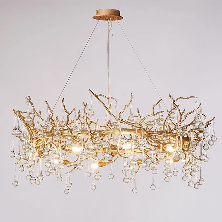 Представьте, как в вашем доме расцветает весна, даже если за окном все еще лежит снег. Кольцевая люстра со стеклянными подвесками в форме капель — это не просто светильник, это настоящее произведение искусства, которое оживит ваш интерьер. Ее ветвистый каркас, словно ветви дерева, просыпающегося после зимы, удерживает сотни хрустальных капель, которые переливаются и играют светом, создавая атмосферу легкости и свежести.