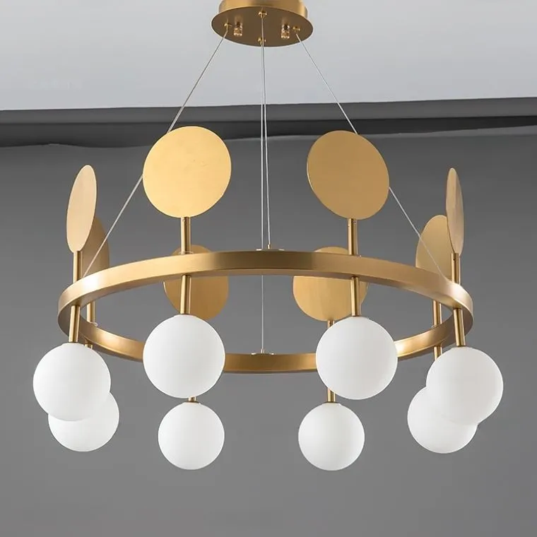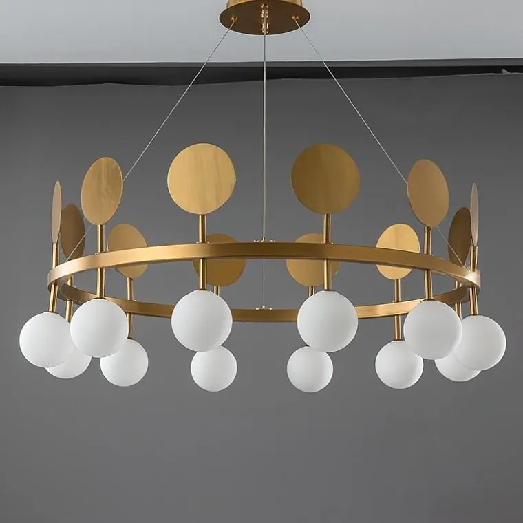 Кольцевая люстра с шарообразными плафонами из стекла и металлическими дисками.