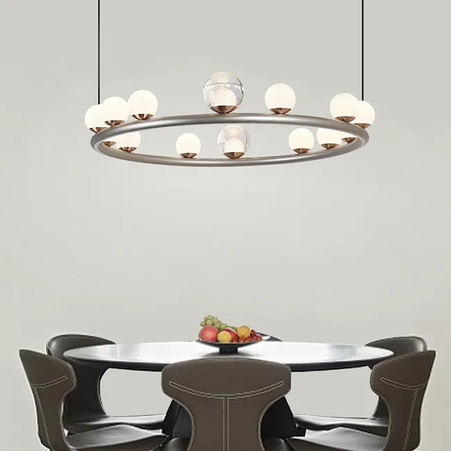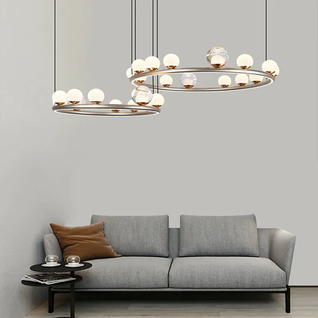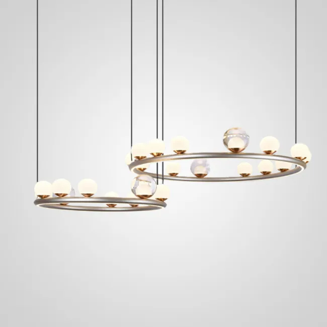 Кольцевая люстра с шарообразными плафонами из стекла и металлическими дисками.