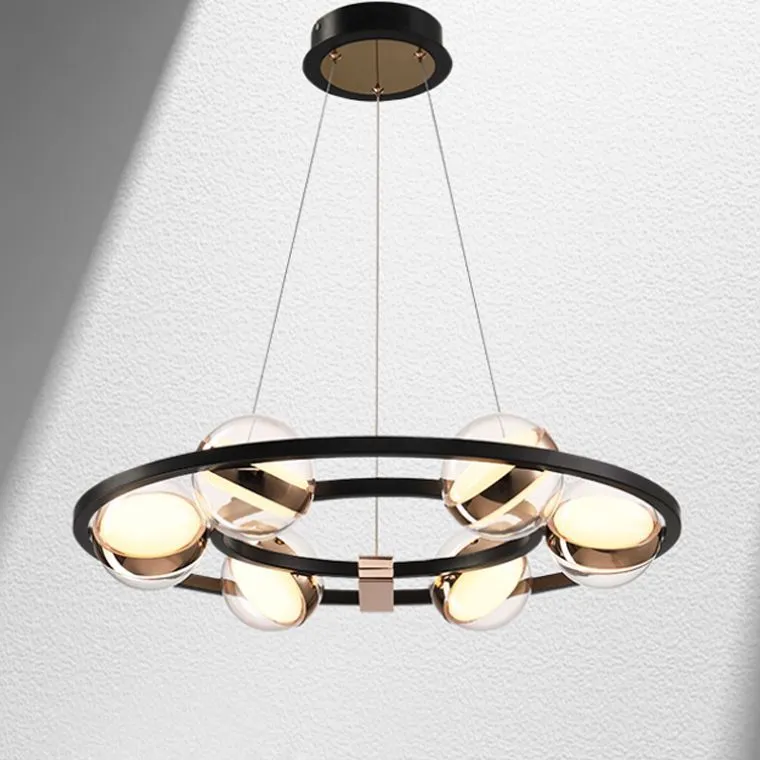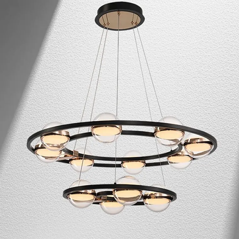 Эти люстры имеют уникальную конструкцию, состоящую из изящных колец, объединенных в единую композицию. Вращающиеся плафоны в форме шара, украшенные декоративным металлическим ободом, придают люстре особый шарм и неповторимость.