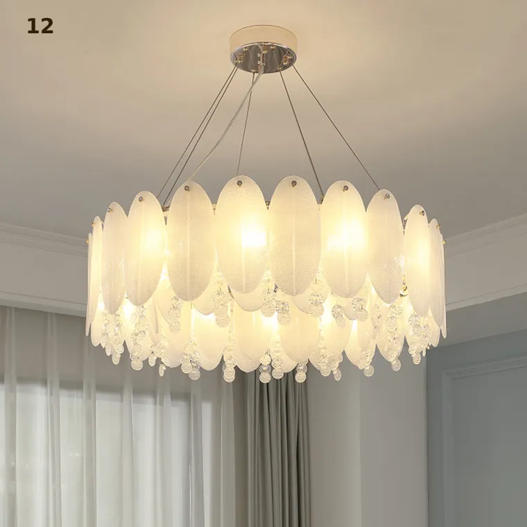 Серия кольцевых люстр с абажуром из дисковидных рельефных подвесок и стеклянных пластин миндалевидной формы
