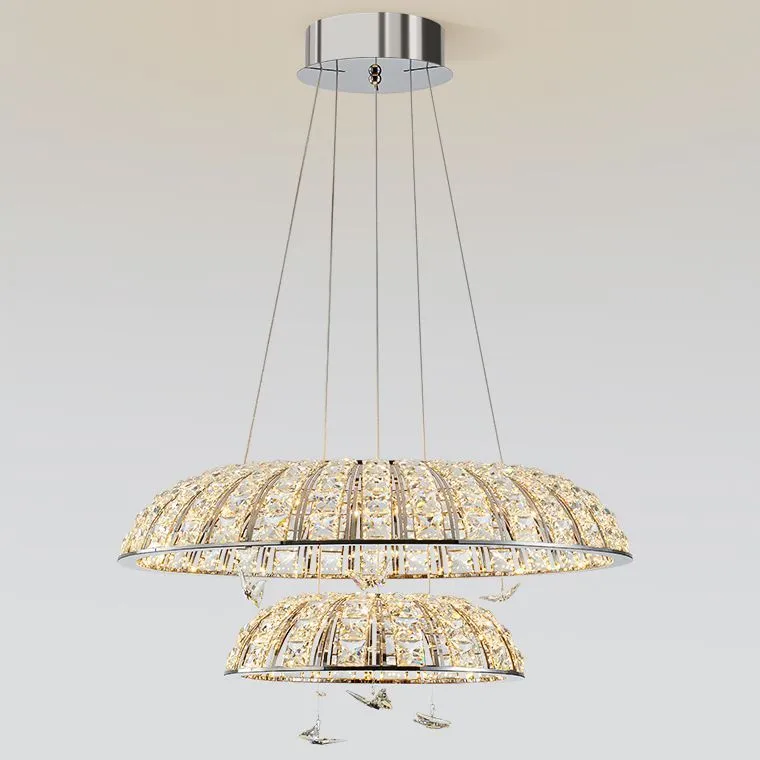 Серия светодиодных кольцевых люстр с двумя плафонами купольной формы из квадратных хрустальных плашек с декоративными подвесками в виде бабочек. Наша серия светодиодных кольцевых люстр с двумя плафонами купольной формы представляет собой уникальное сочетание элегантности и изящества в вашем интерьере. Плафоны изготовлены из квадратных хрустальных плашек, которые создают запоминающийся блеск и игру света.