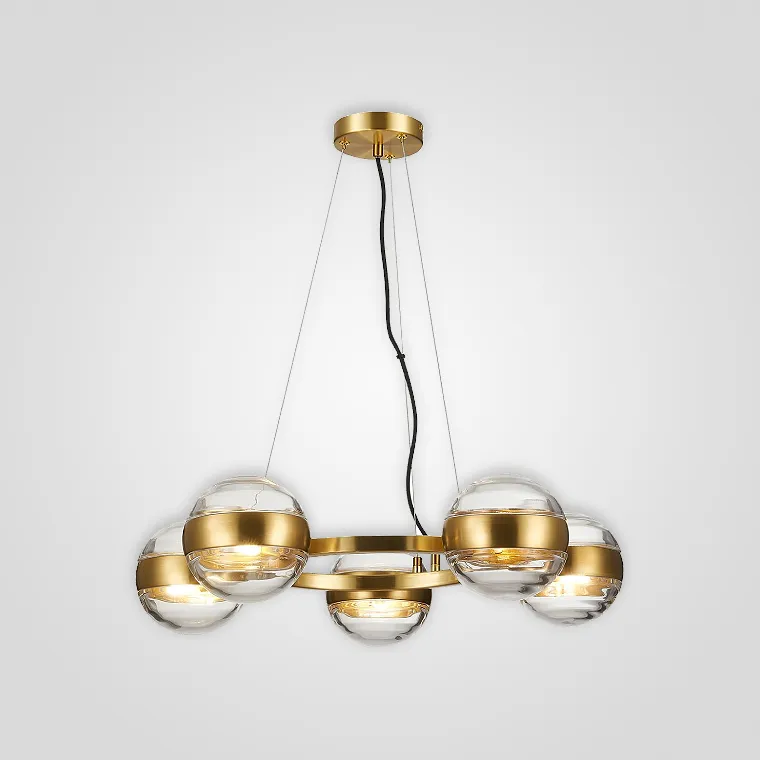Люстра на струнном подвесе с шарообразными плафонами на кольцевом каркасе латунного