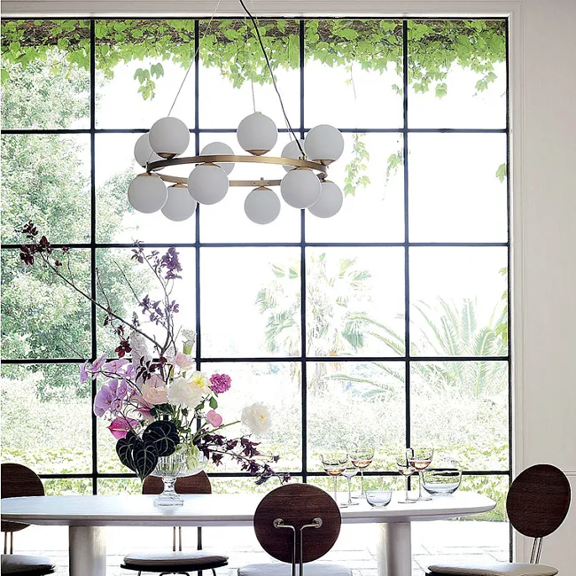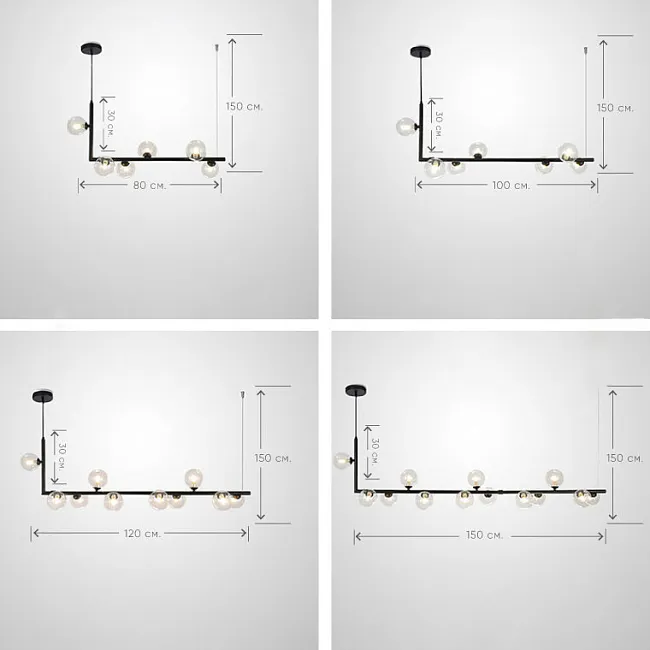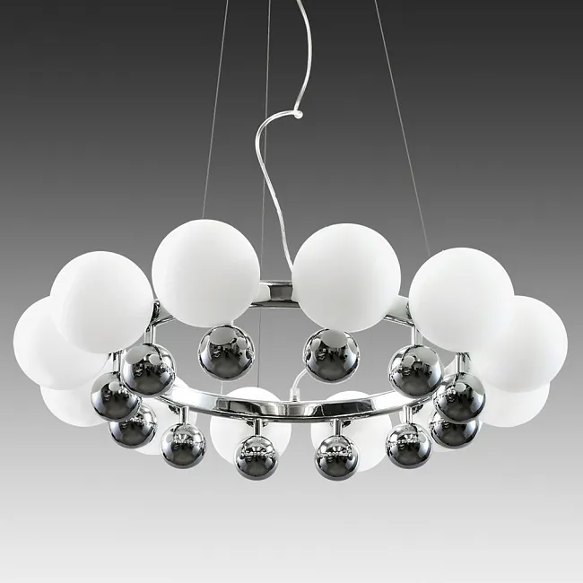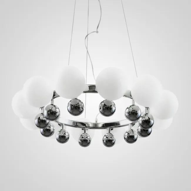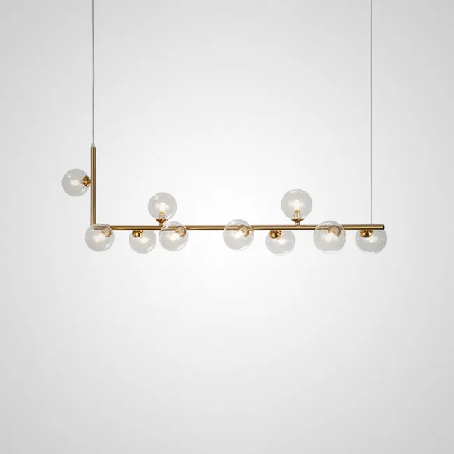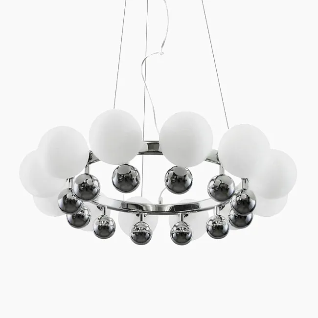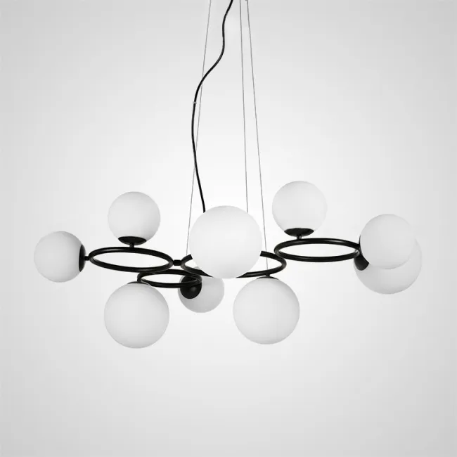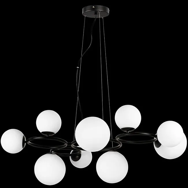 Люстра на струнном подвесе с шарообразными плафонами на кольцевом каркасе латунного