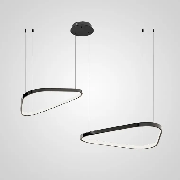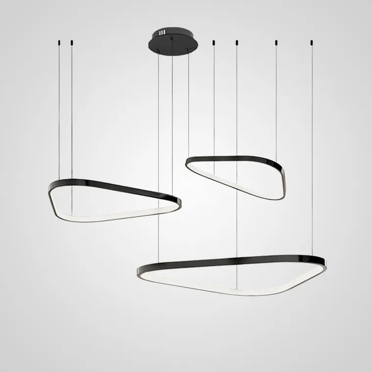 Серия кольцевых люстр в форме треугольников с сглаженными углами, разными размерами и черным каркасом подойдет для тех, кто стремится к современному и элегантному стилю, придавая интерьеру немного загадочности и роскоши.