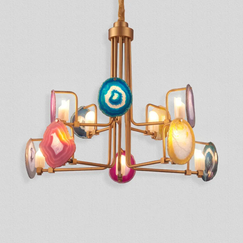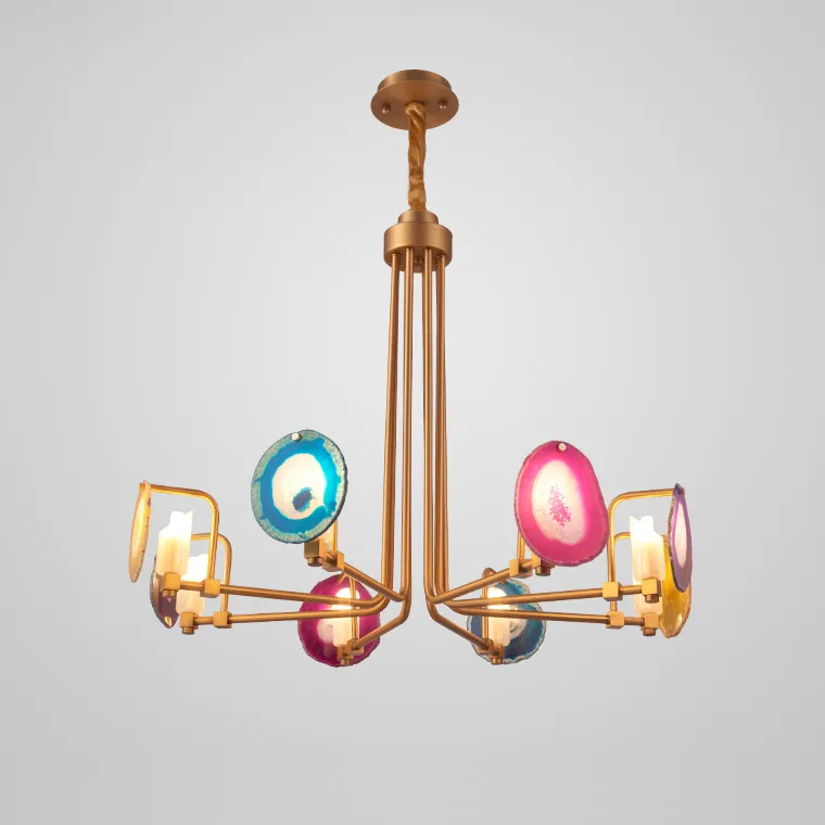 Каждый плафон изготовлен из натурального агатового спила, что придает люстре неповторимый шарм и индивидуальность. Металлический каркас золотого цвета гармонично сочетается с разноцветными агатами, создавая яркую и запоминающуюся композицию. Цоколь G9 позволяет использовать различные типы ламп для создания нужного настроения.