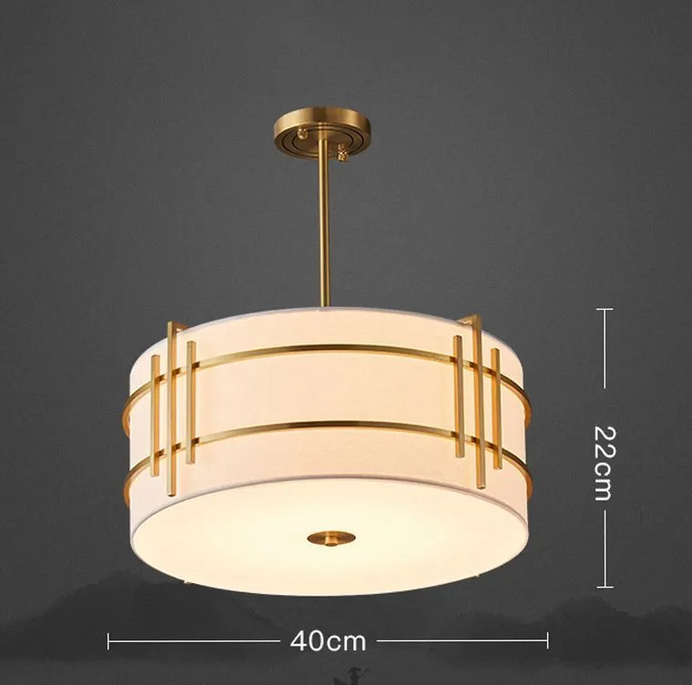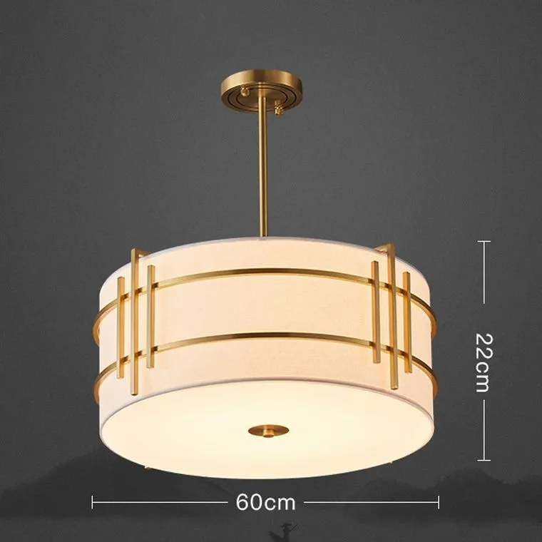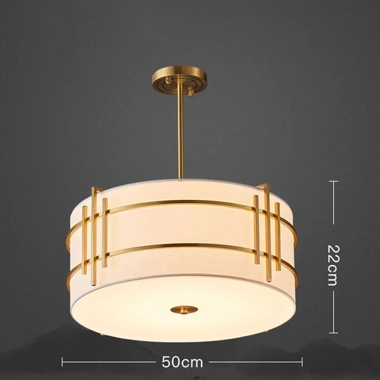 Дизайнерская люстра с текстильным абажуром цилиндрической формы в металлическом корпусе латунного оттенка