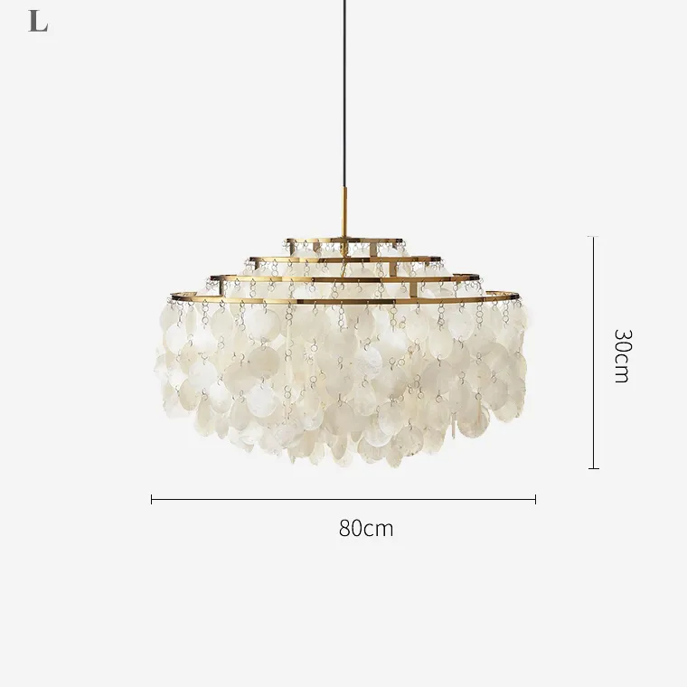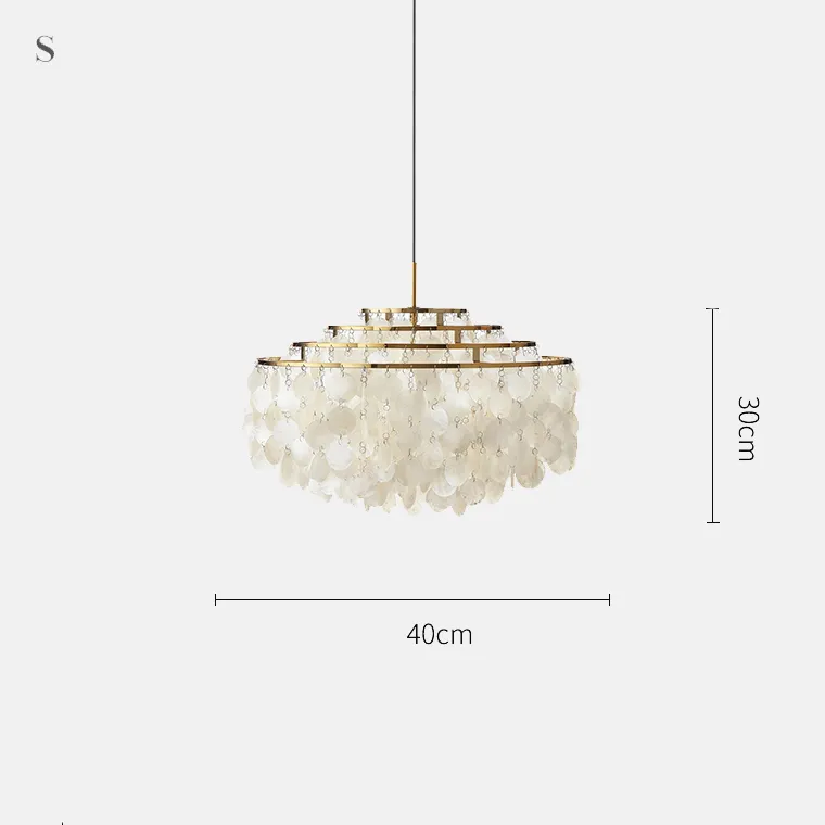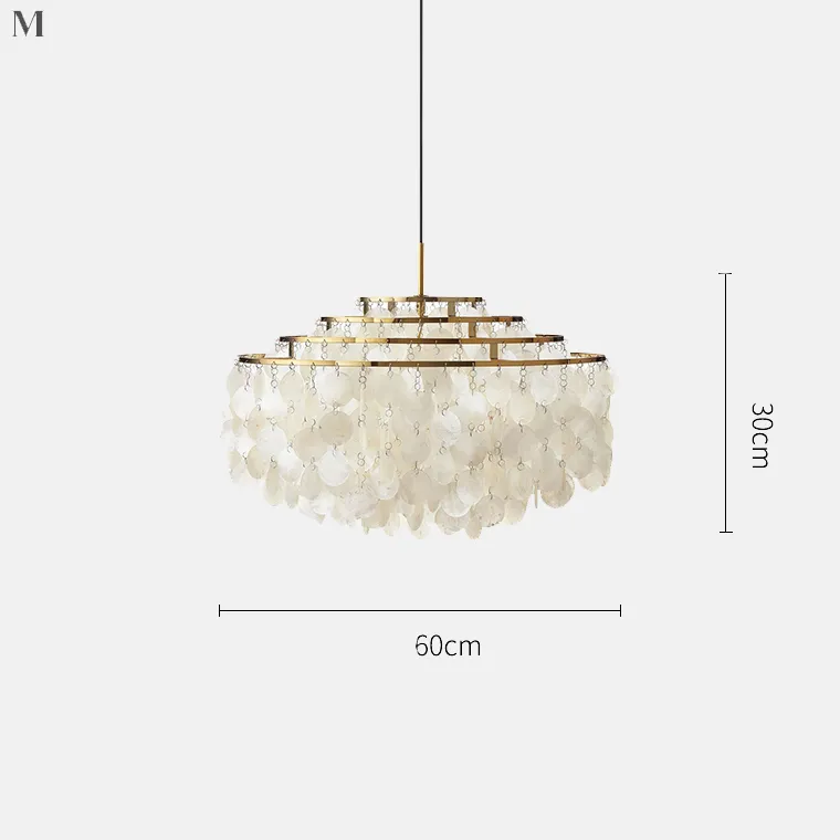 Люстра состоит из пяти ламп и представлена в трех размерах: Ø 40×30 см, Ø 60×30 см и Ø 80×30 см. Металлический каркас окрашен в золотистый цвет, а плафоны выполнены из перламутровых пластин, которые придают люстре особую изысканность и шарм. Благодаря регулируемой длине подвеса, можно легко настроить люстру под высоту вашего потолка.