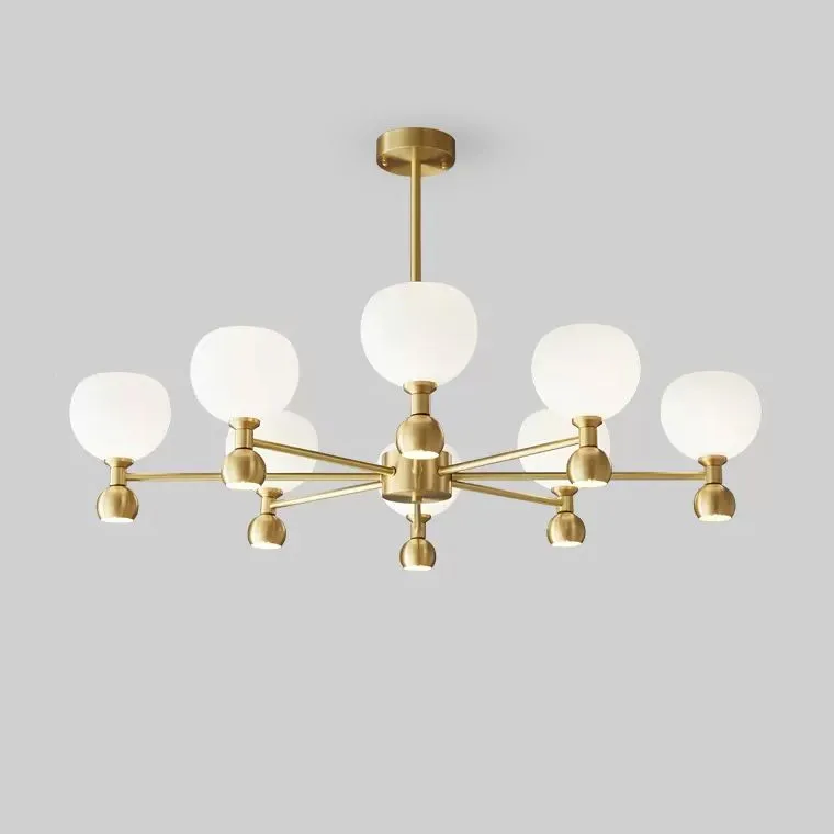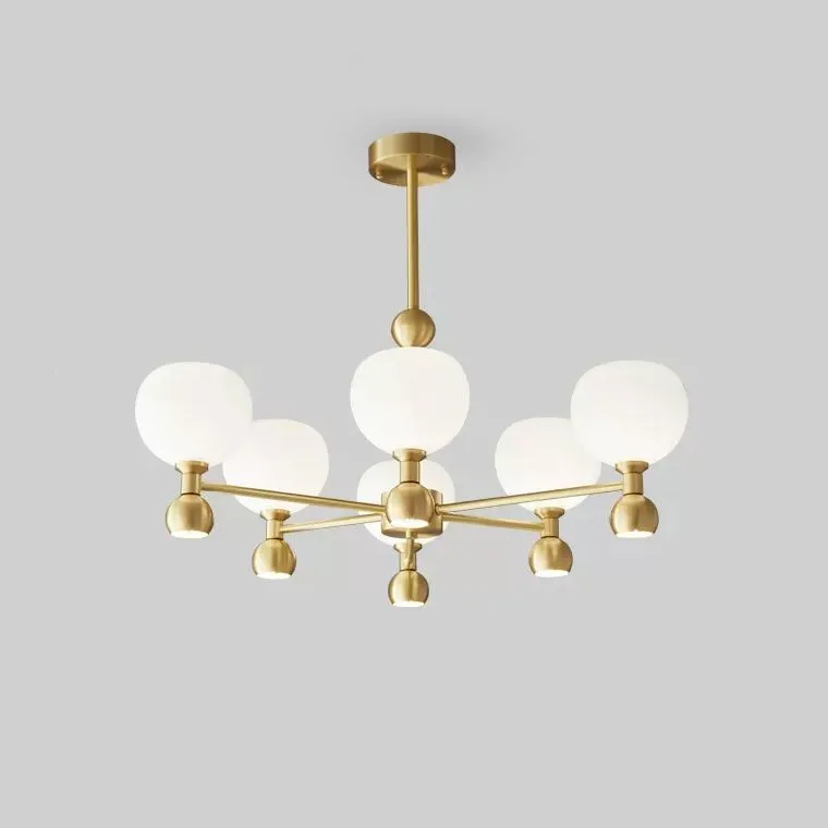 Вдохновленная эстетикой цветов хлопка, наша люстра создаст неповторимую атмосферу на вашей кухне, особенно в зоне над столом. Белые шары, направленные вверх, будут восхищать своей нежностью и мягким светом, создавая уют и комфорт. В то же время, маленькие латунные плафоны с направленным вниз светом добавят направленный световой поток в ваше пространство.
