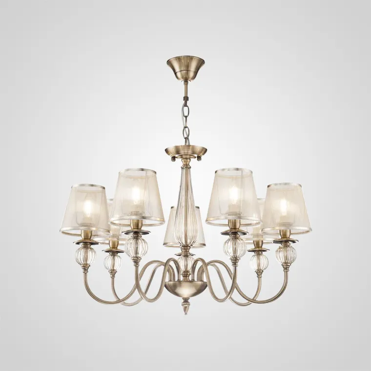 Подвесная люстра с конусными плафонами из органзы и корпусом декорированным вставками из рифленого стекла Люстру можно использовать как потолочную версию