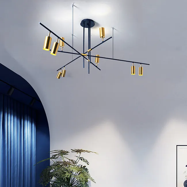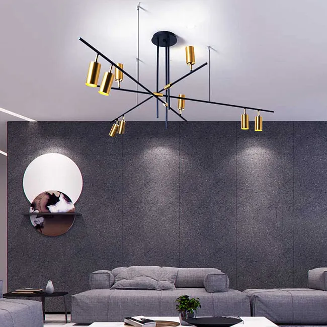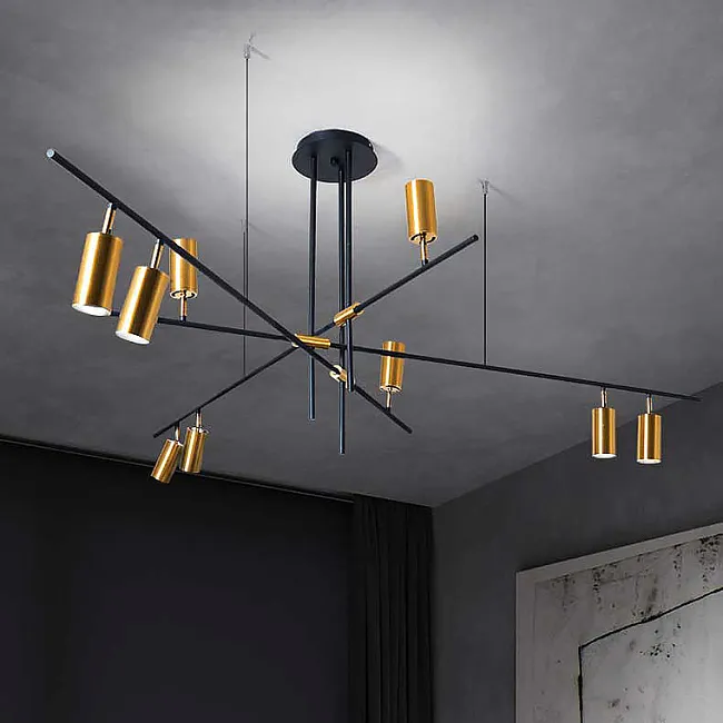 Люстра CASA — мечта ценителя стильных помещений. Асимметричное расположение черных металлических штанг по горизонтали и вертикали придает осветительному прибору особый шик и неповторимость. Поворотные светильники позволяют менять направление света и внешний вид люстры. Плафоны в золотом или черном цвете подчеркивают стиль «минимализм», в котором выполнено изделие.