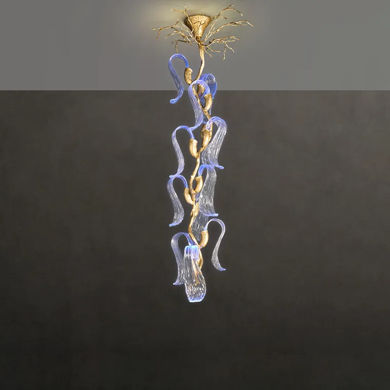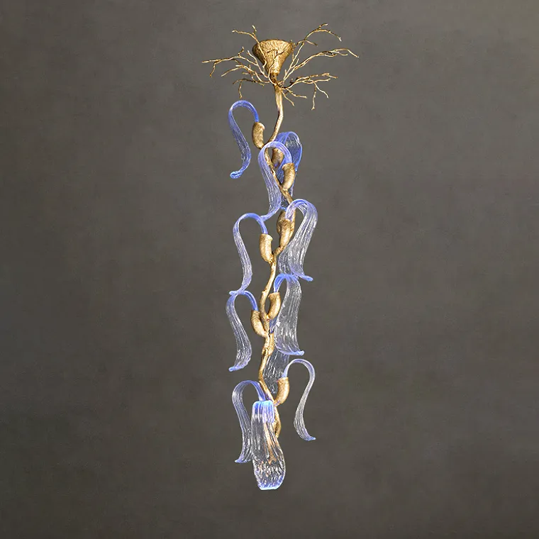 Люстра в виде замерзшего фонтана с плафонами из хрусталя на вытянутом металлическом каркасе, стилизованном под дерево
