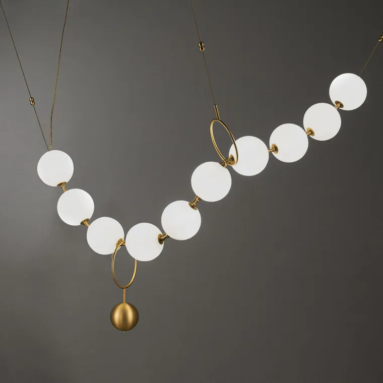 Уникальное сочетание стиля и красоты: подвесная люстра COCO, выполненная в виде жемчужных бус, станет изюминкой вашего интерьера. Плафоны выполнены в матово-белом цвете, их количество — 10 штук. Каркас — золотой. Расположить их можно как угодно: по кругу, вдоль стены, над обеденным столом.
