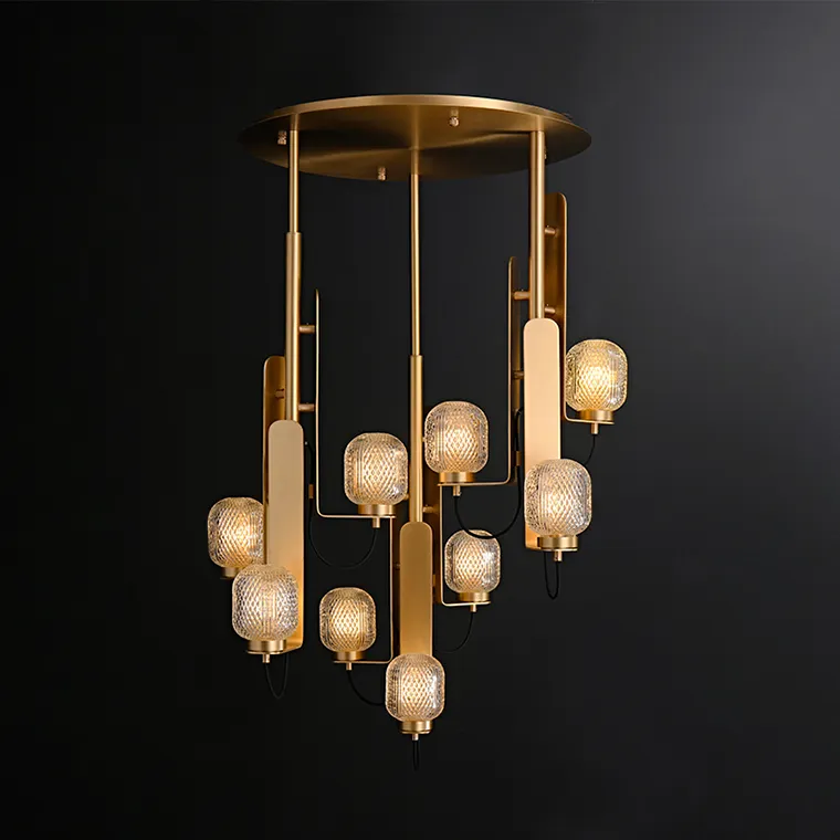 Люстра на стойке с рельефными шарообразными плафонами из стекла на латунном крепеже с декоративными вытянутыми элементами