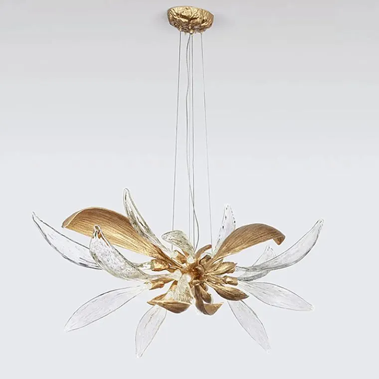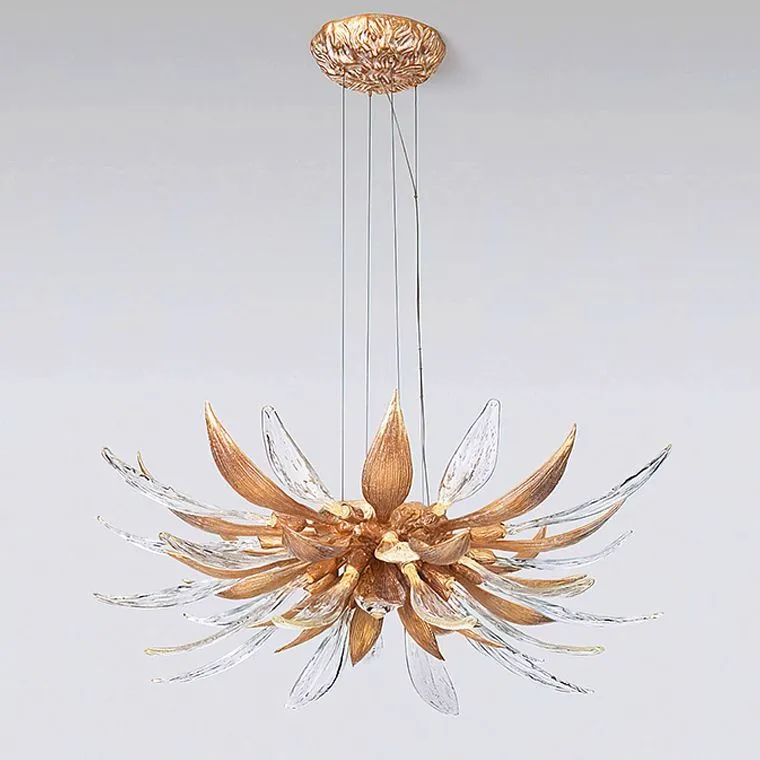 Детализированные стеклянные лепестки, устремленные вверх, словно ловят солнечные лучи, наполняя пространство мягким, теплым светом. Латунные элементы добавляют благородный блеск, подчеркивая изысканность и современность дизайна. Этот светильник — не просто источник света, а центральный элемент интерьера, который приковывает взгляды и задает тон всему помещению.