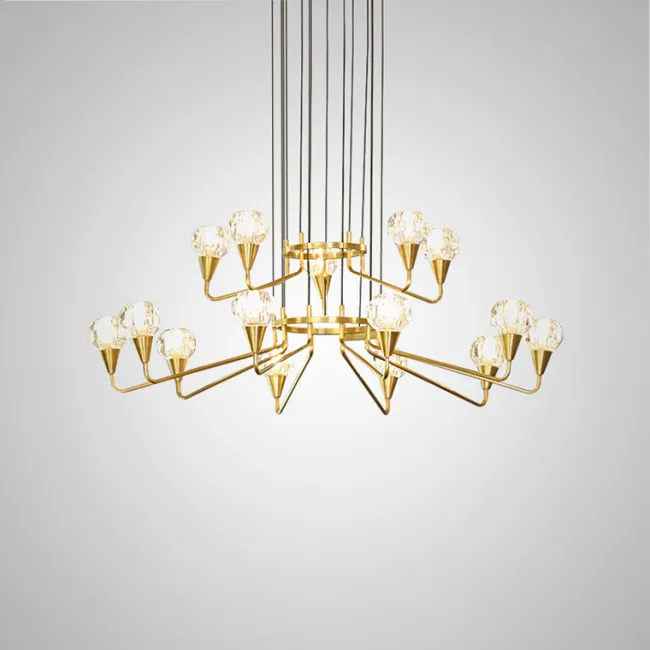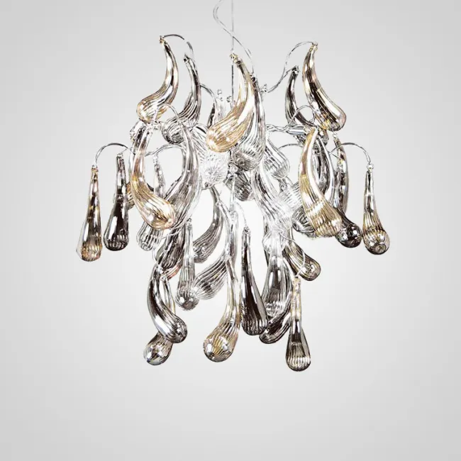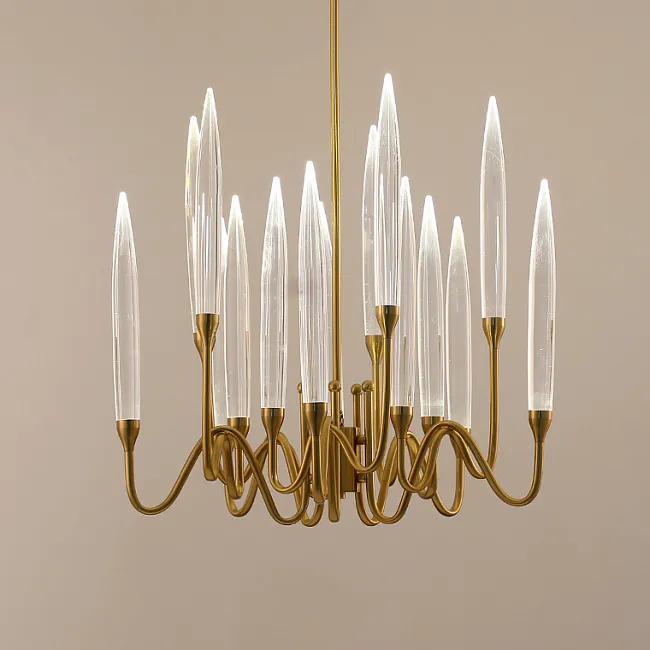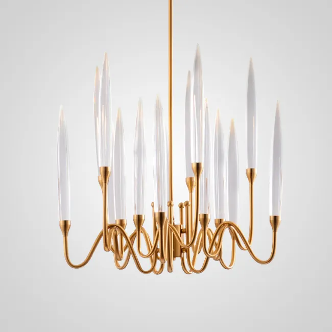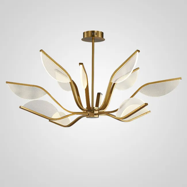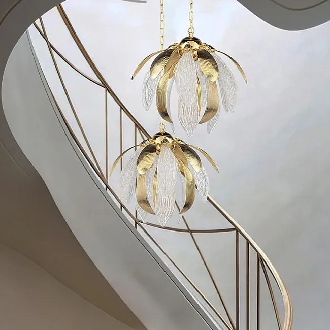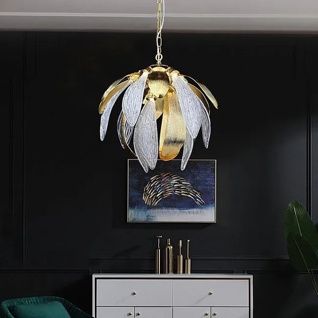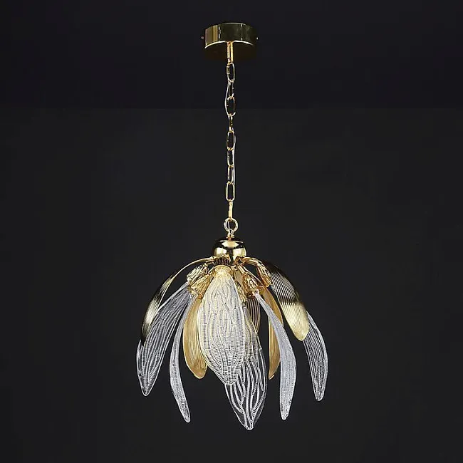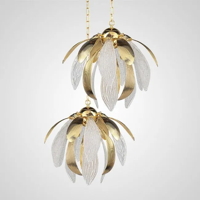 Детализированные стеклянные лепестки, устремленные вверх, словно ловят солнечные лучи, наполняя пространство мягким, теплым светом. Латунные элементы добавляют благородный блеск, подчеркивая изысканность и современность дизайна. Этот светильник — не просто источник света, а центральный элемент интерьера, который приковывает взгляды и задает тон всему помещению.