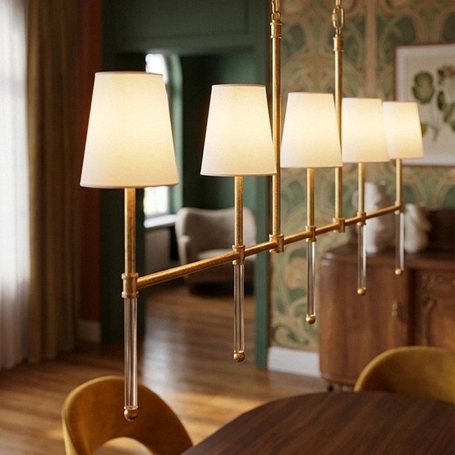 Подвесная люстра с коническими текстильными абажурами на сборных стойках из хрусталя и латуни