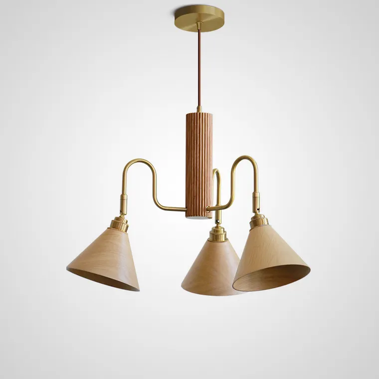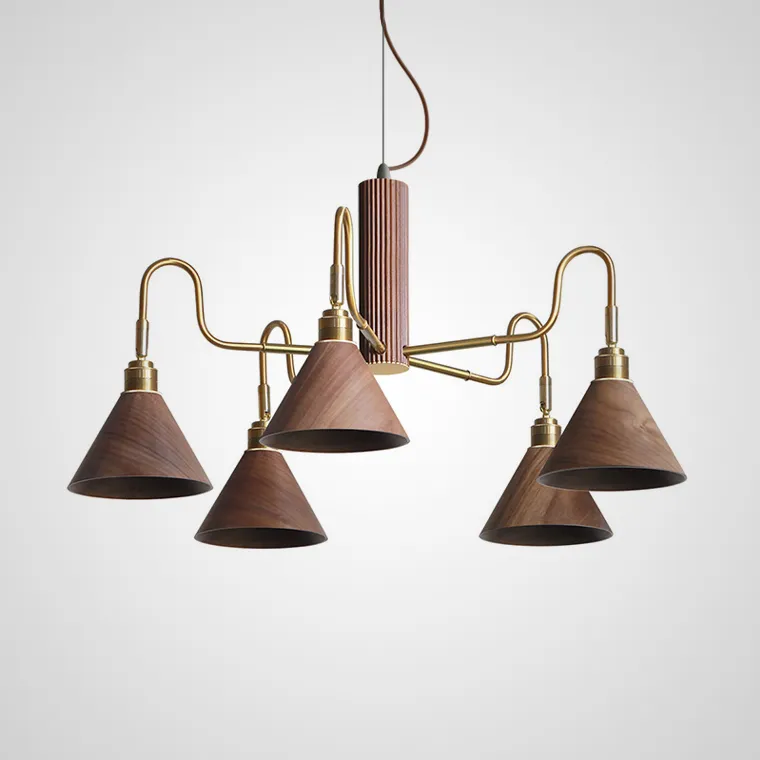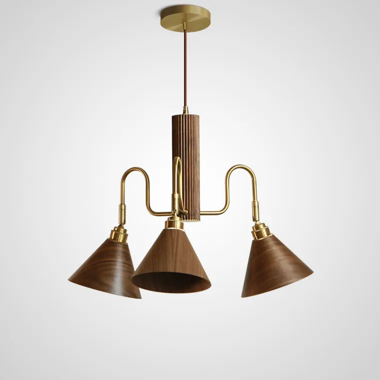 Серия подвесных люстр с поворотными плафонами конусообразной формы из натурального дерева темного ореха и светлого дуба с латунной отделкой