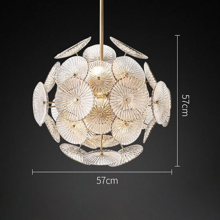 Центральная латунная стойка, поддерживающая сверкающий шар, рассылает вокруг себя лучи, на концах которых как будто парят рельефные диски-рассеиватели. Каждый такой диск подобен лепестку экзотического цвета, распустившегося исключительно для вас. Или, возможно, в их загадочной красоте вы увидите фантастического жителя морских глубин, который своим присутствием преображает все пространство вокруг.