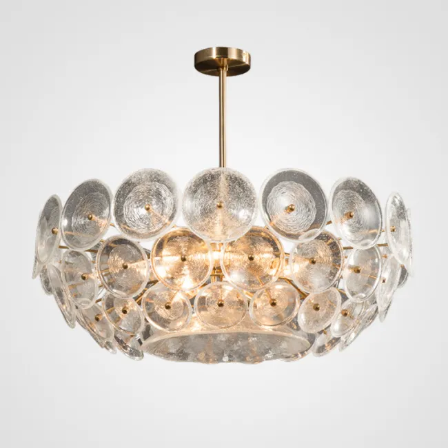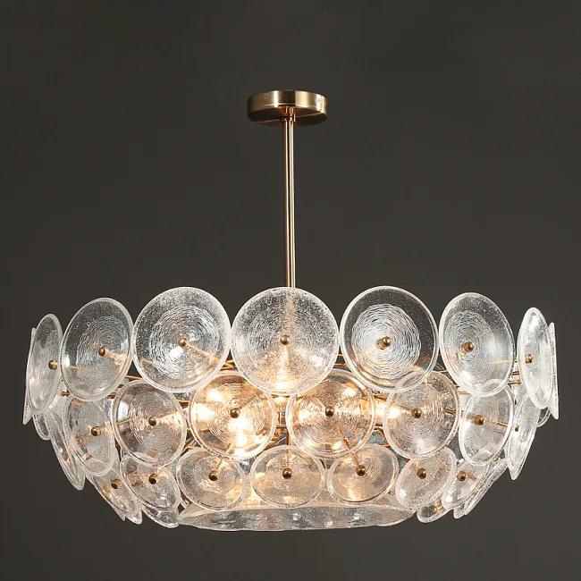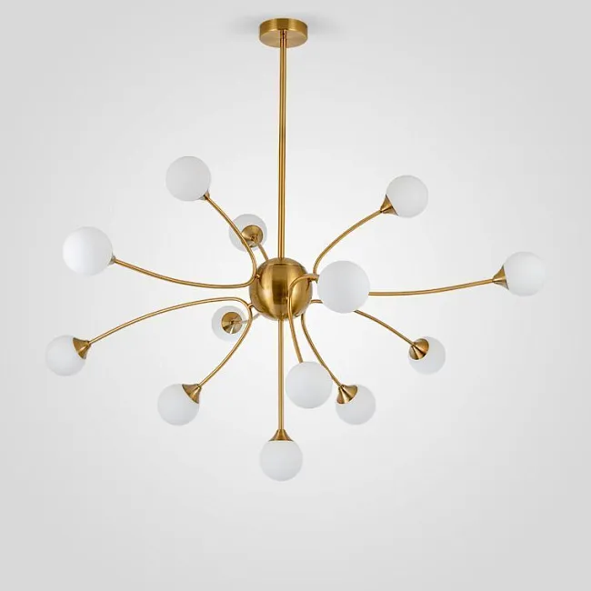 Центральная латунная стойка, поддерживающая сверкающий шар, рассылает вокруг себя лучи, на концах которых как будто парят рельефные диски-рассеиватели. Каждый такой диск подобен лепестку экзотического цвета, распустившегося исключительно для вас. Или, возможно, в их загадочной красоте вы увидите фантастического жителя морских глубин, который своим присутствием преображает все пространство вокруг.