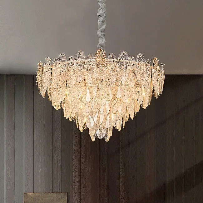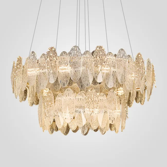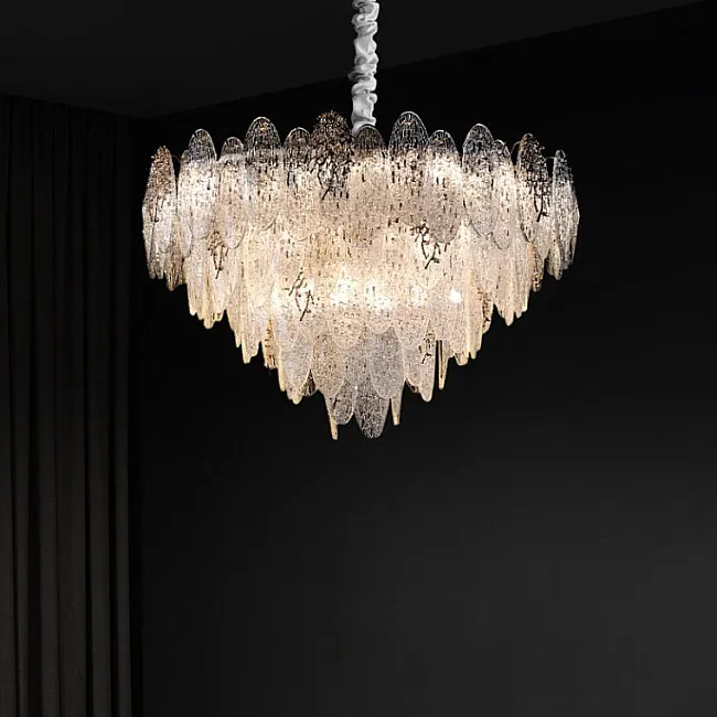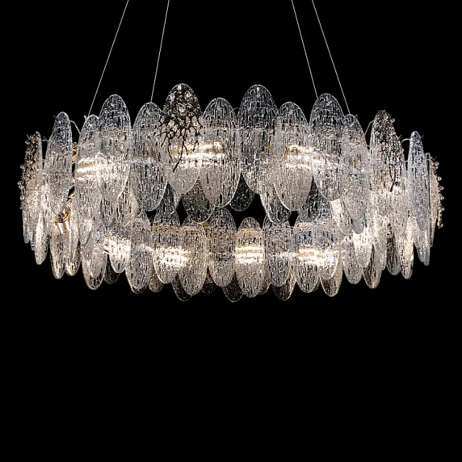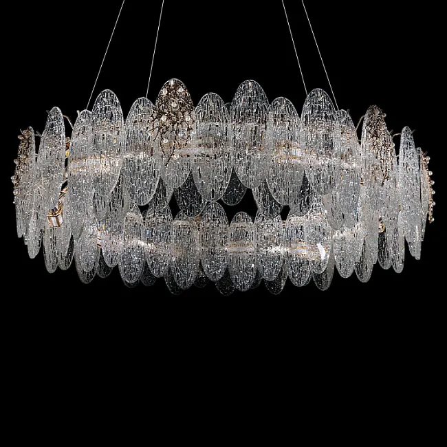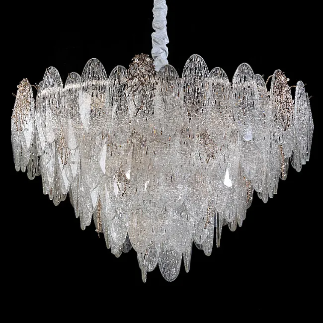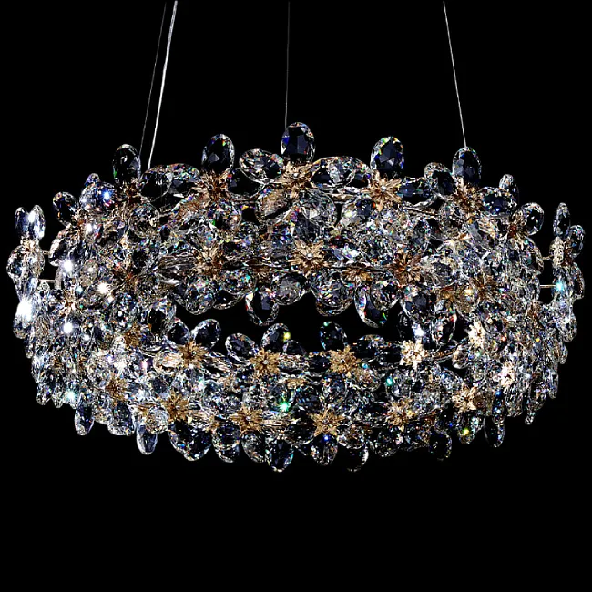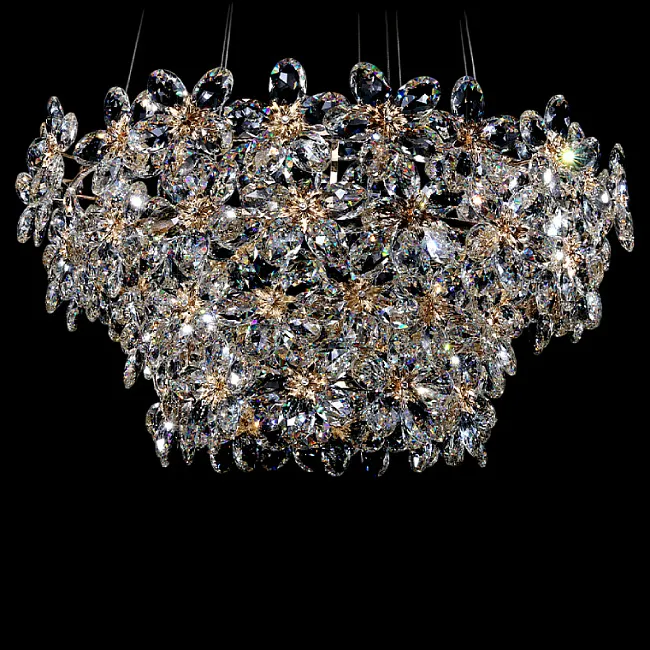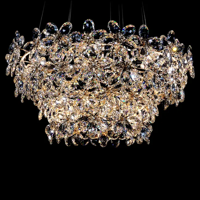 Серия люстр с многоярусным абажуром с подвесками из ограненного хрусталя и декоративных цветков из рельефного стекла