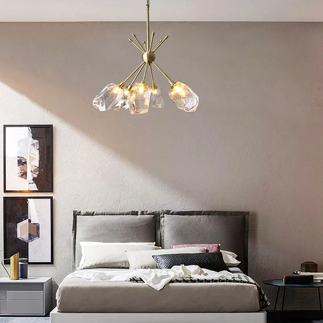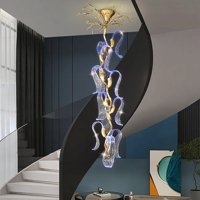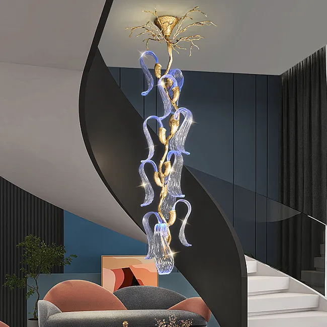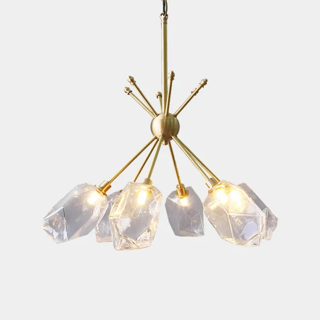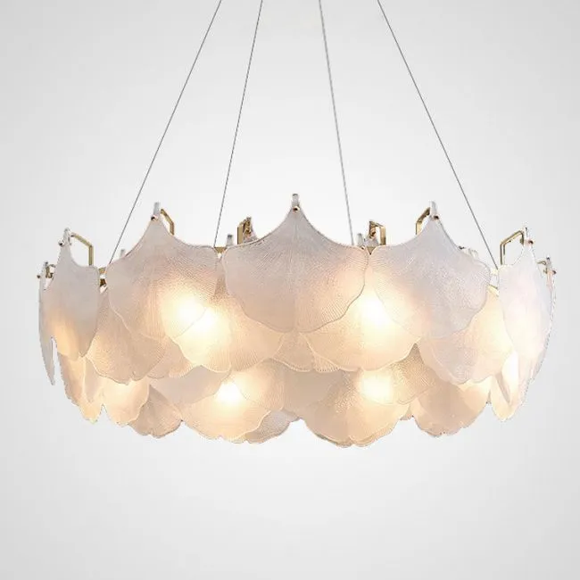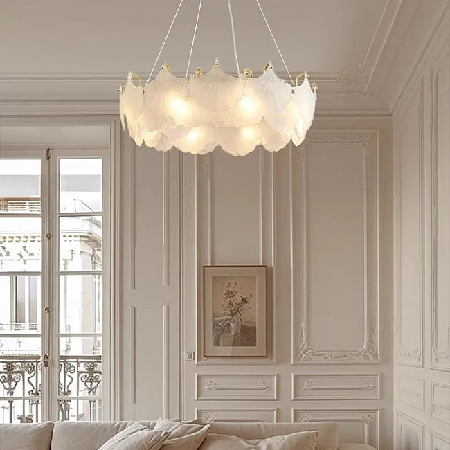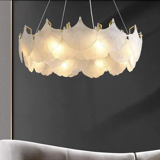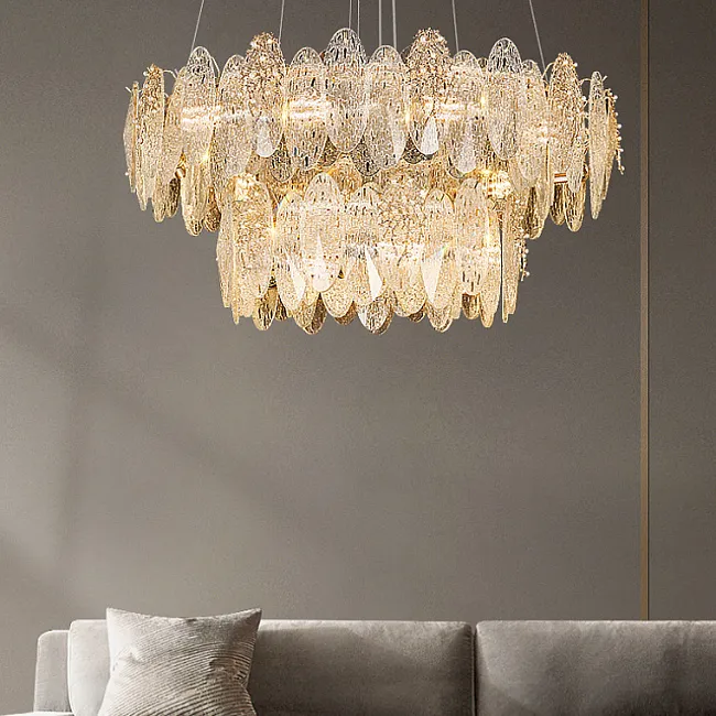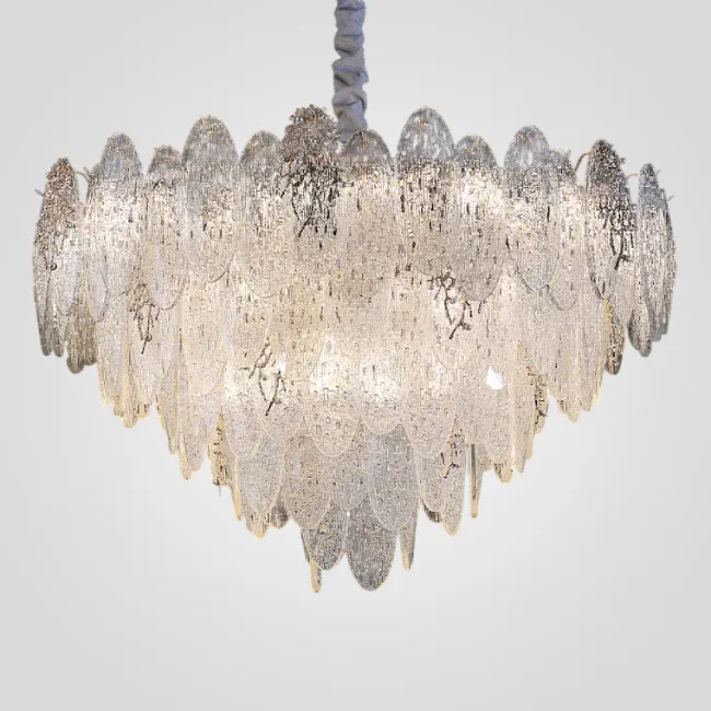 Серия люстр с многоярусным абажуром с подвесками из ограненного хрусталя и декоративных цветков из рельефного стекла