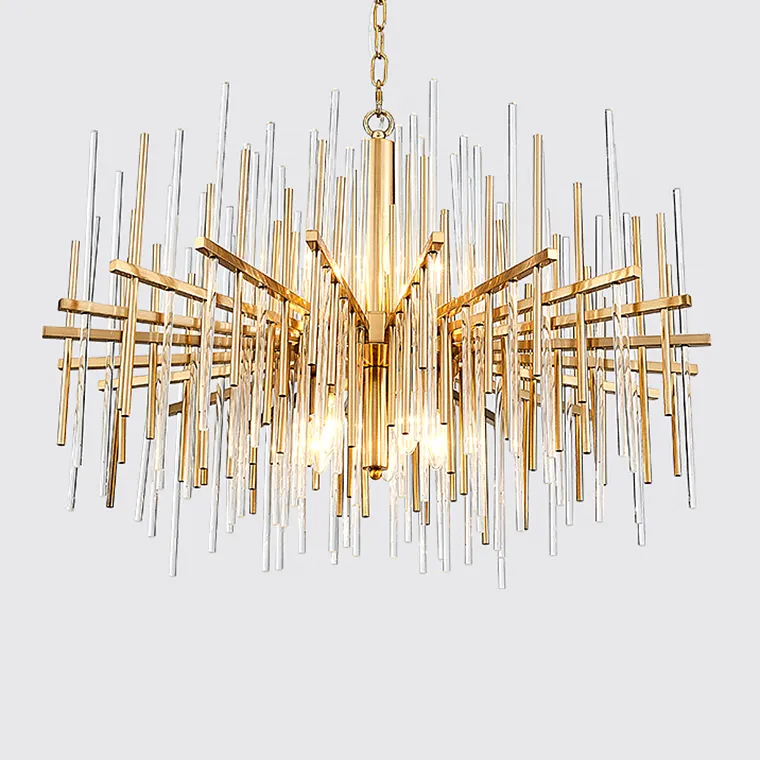 много лучей из центра, а на них стержни из стекла и металла. Лампочки в центре и когда они включены, свет проходит через все стержни и глаза совершенно не слепит, а по комнате прямо разливается.