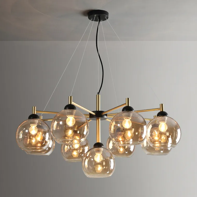 Форма плафона усеченного шара в сочетании с цветами золота или черного каркаса и янтарными плафонами придают этой люстре неповторимый артистический вид. Материалы, использованные в изготовлении - металл и стекло, обеспечивают прочность и надежность.