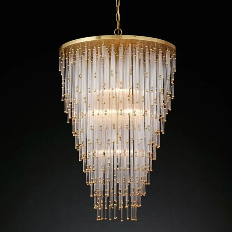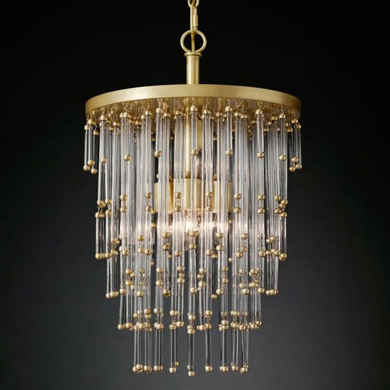 Стеклянная люстра в стиле постмодерн с абажуром из стеклянных стержней с латунными декоративными шариками