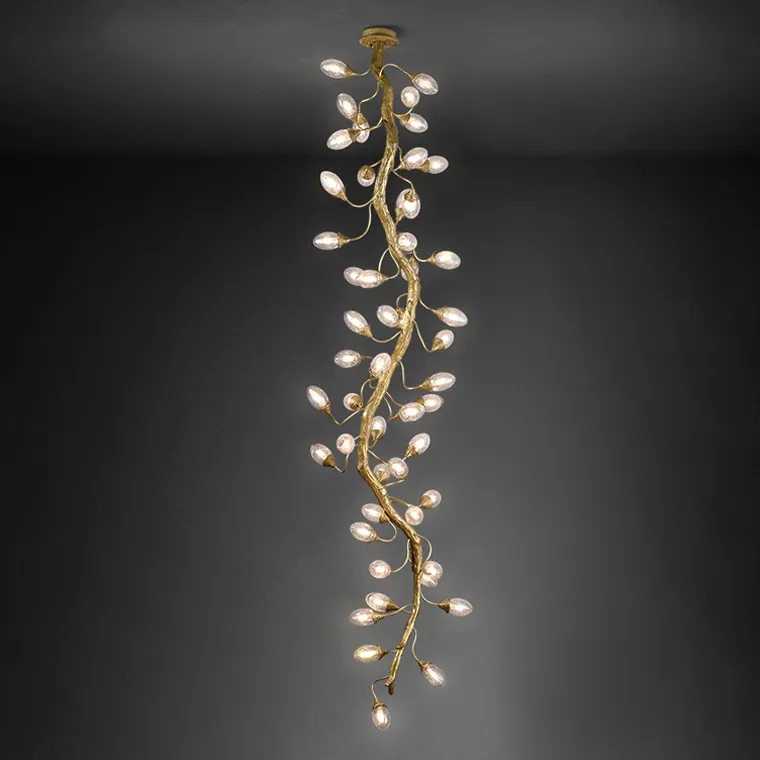 Люстра с эллиптическими плафонами из стекла с эффектом воздушных пузырьков на вытянутом металлическом каркасе, стилизованном под дерево