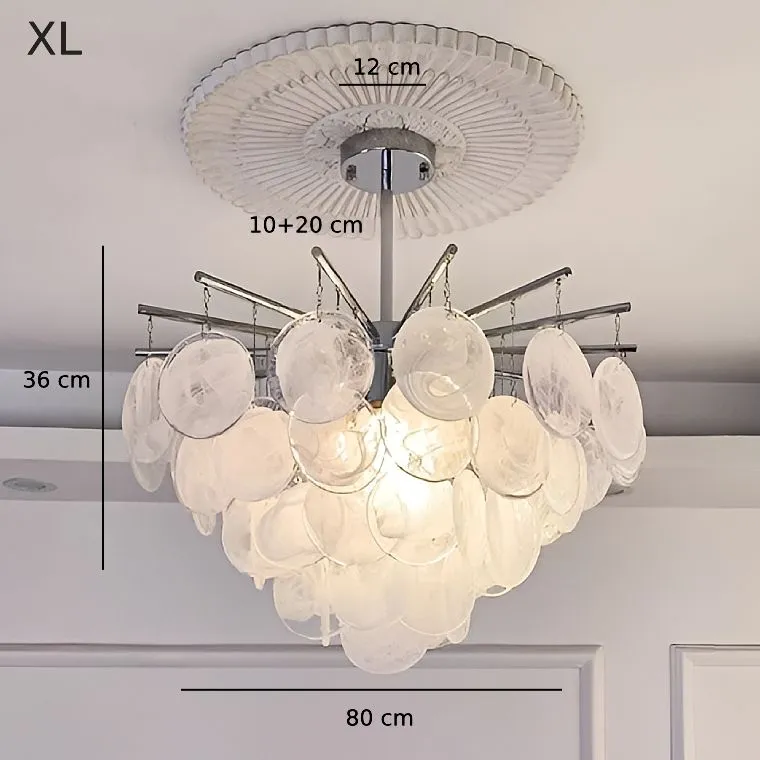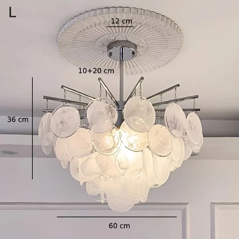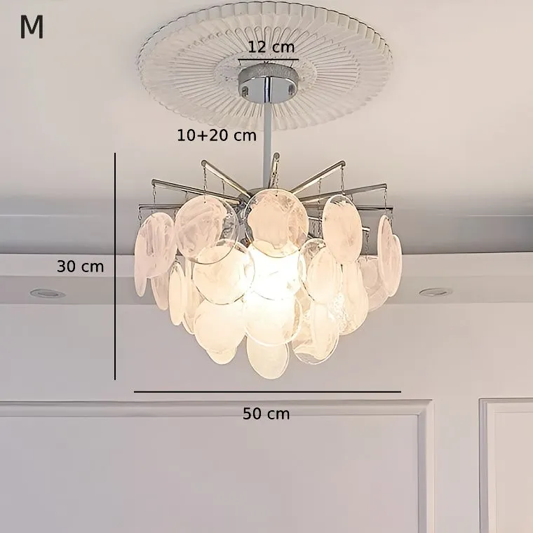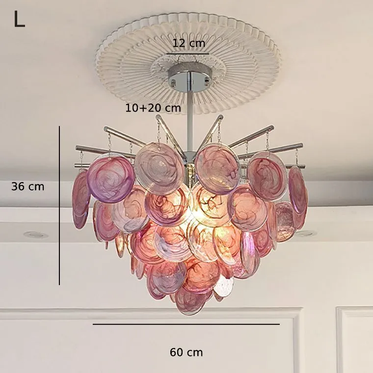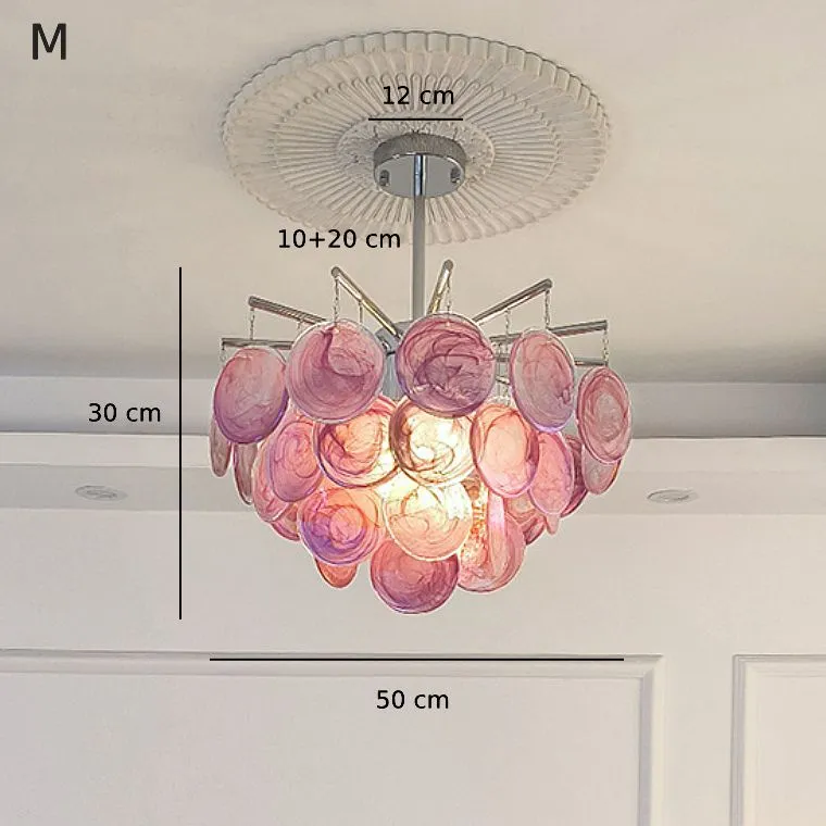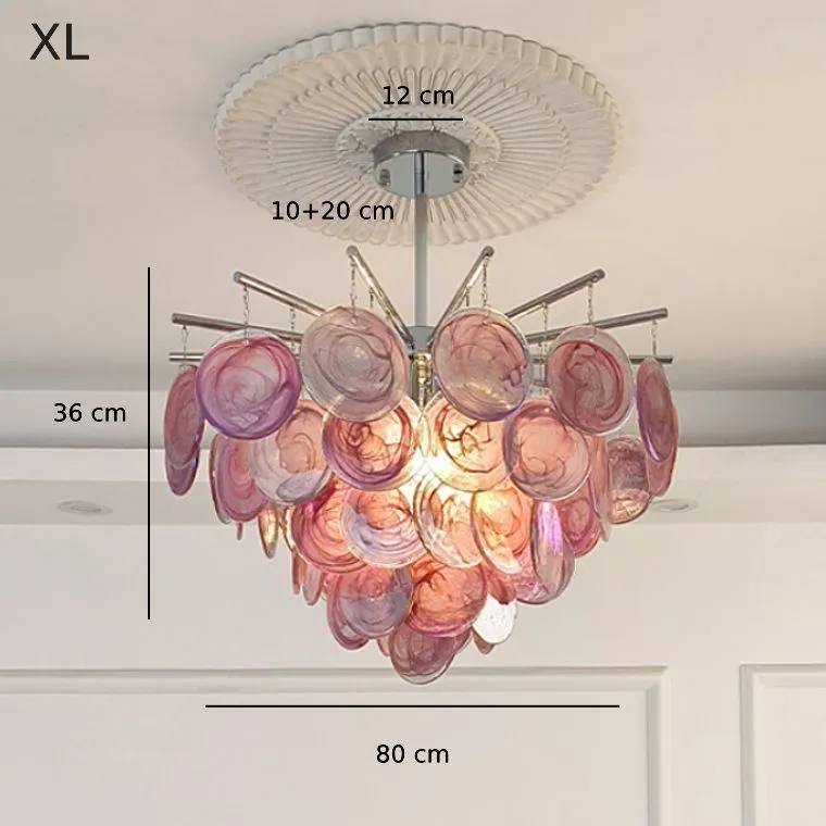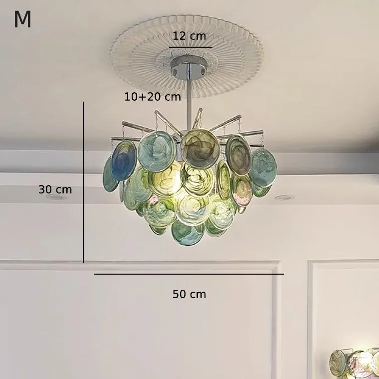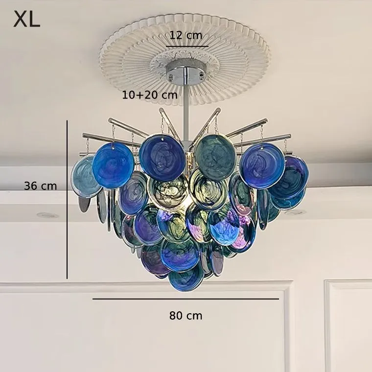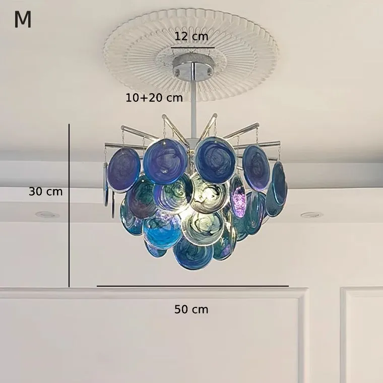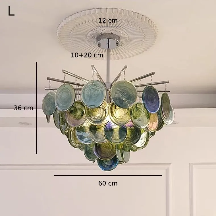 Серия люстр с подвесками из стеклянных дисков различных оттенков с дымчатым узором. Оттенок цвета и узор на стеклянных пластинах может отличаться от представленных на фото из-за особенностей технологических процессов обжига стекла и температурными взаимодействия с применяемыми красителями.