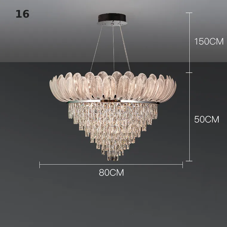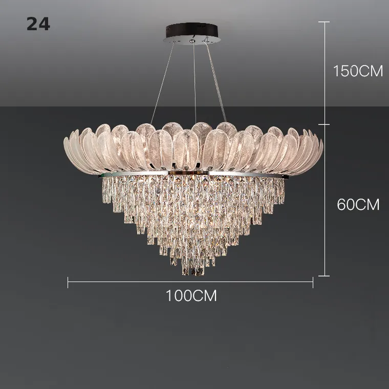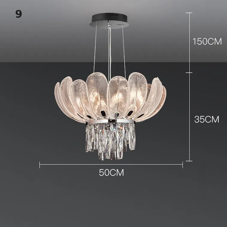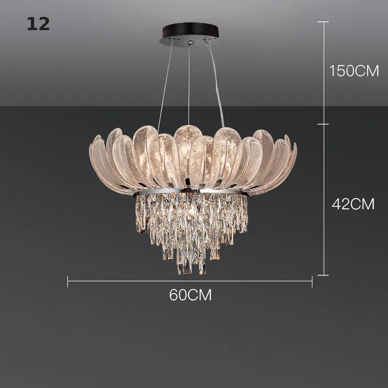 Серия люстр с изогнутыми вверх пластинчатыми рассеивателями в виде перьев и декором в виде хрустальных подвесок