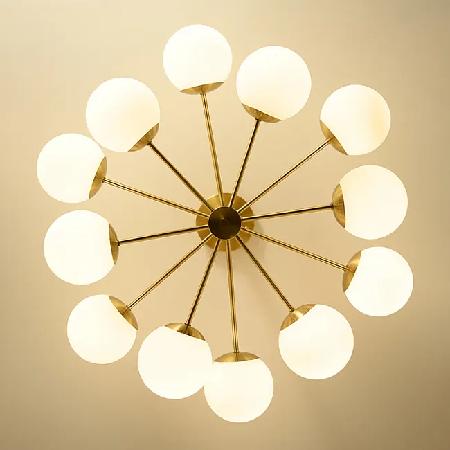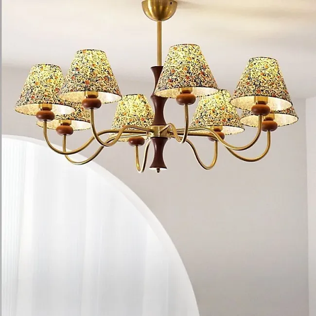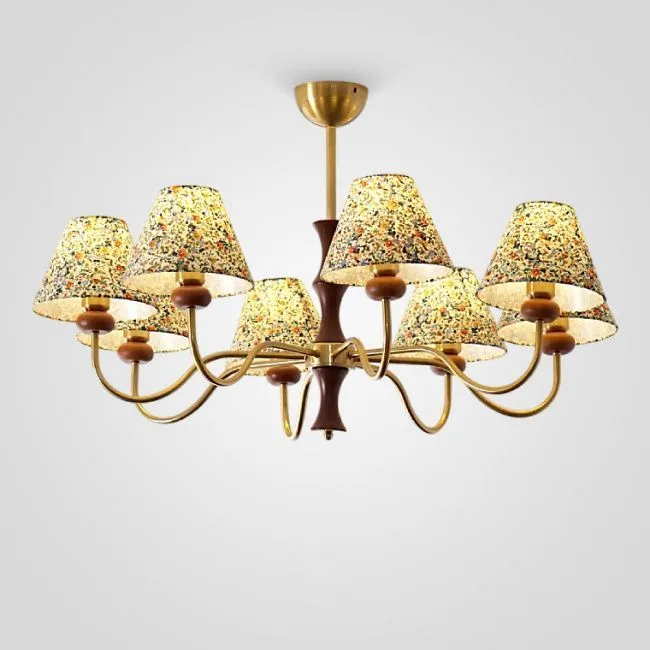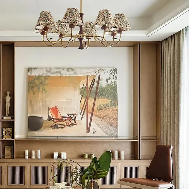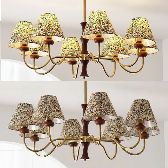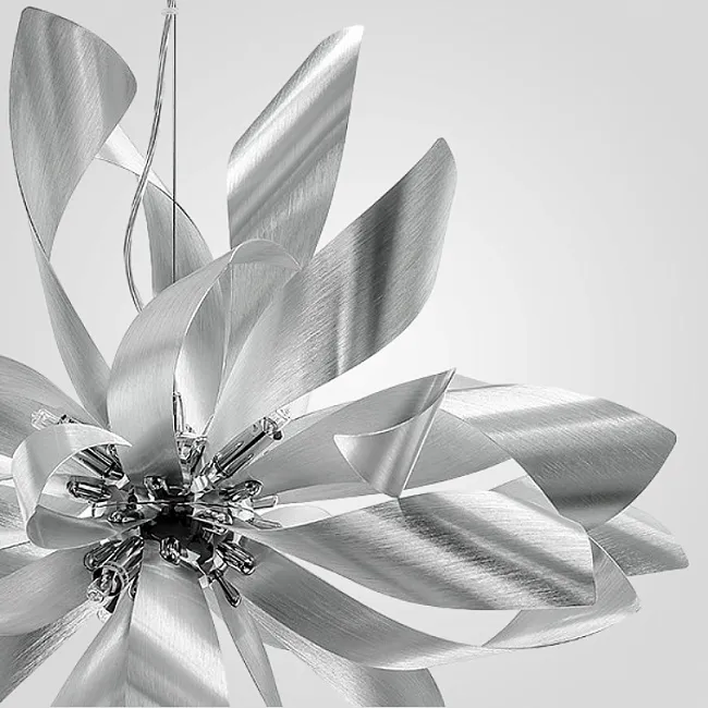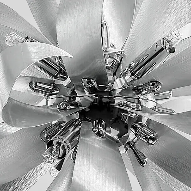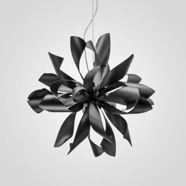 Рельефность плафонов добавляет глубины и объемности световому полотну, создавая игру светотеней и переливов, словно абстрактную картину, живую и колоритную. Каждый элемент этой люстры, будучи сам по себе произведением искусства, взаимодействует с остальными, создавая удивительный эффект легкости и грации.