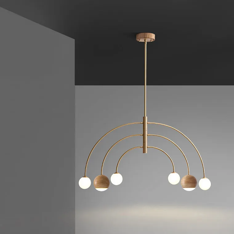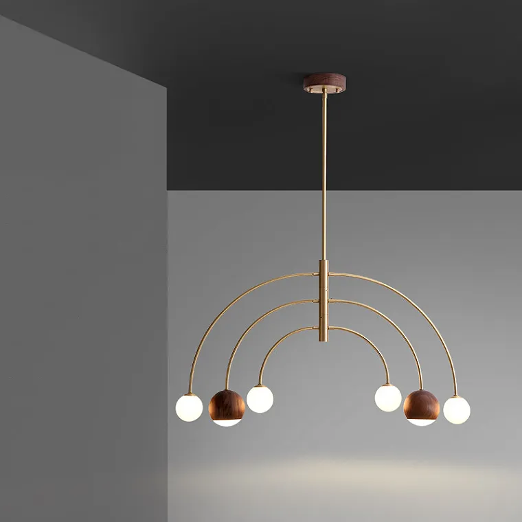 Дизайнерская светодиодная люстра с шарообразными матовыми плафонами и плафонами с деревянной отделкой на C-образных рожках из латуни
