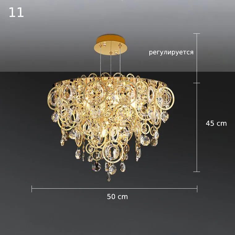 Серия люстр в виде комбинации колец и хрустальных подвесок на металлическом каркасе