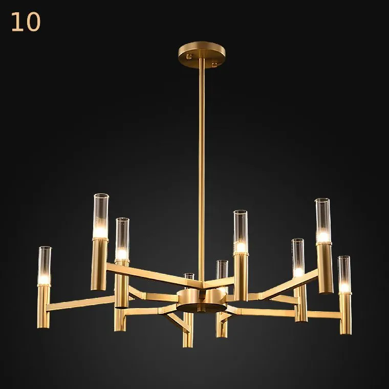 Сияющие стеклянные плафоны цилиндрической формы великолепно сочетаются с разветвленным каркасом, создавая неповторимый образ, который привлекает взгляды и уносит в мир роскоши. Латунный корпус, с его молекулярной формой, восхищает своей изысканностью и придает люстре особый шарм.