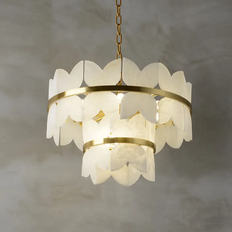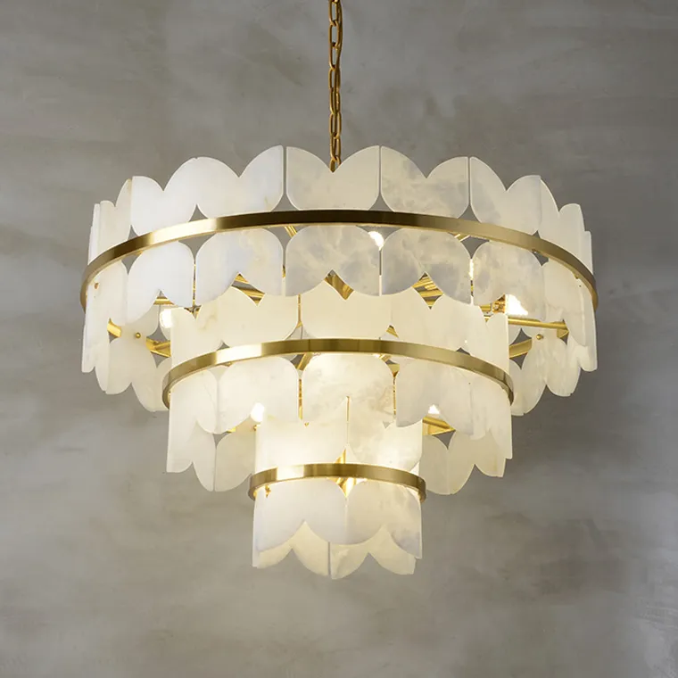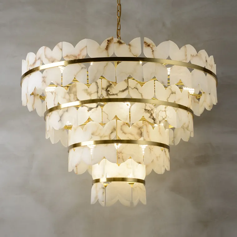 Серия многоярусных люстр на цепном подвесе с абажуром из тонких зубчатых пластин из натурального мрамора