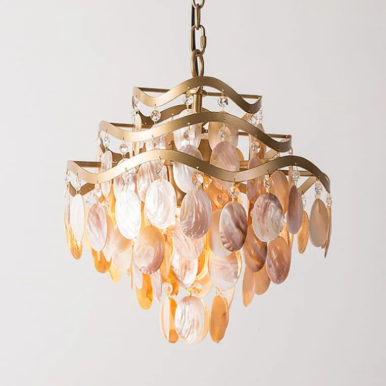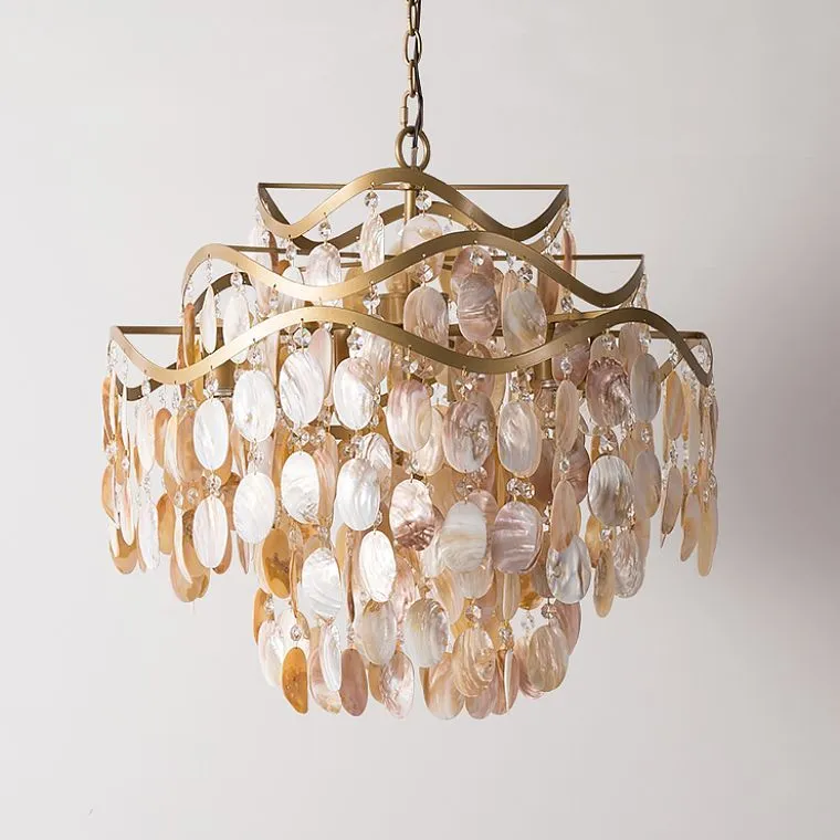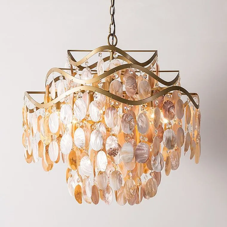Подвески, изготовленные из блистательного перламутра, придают этой люстре изящество и утонченность. Каркас, выполненный из золотого металла, образует волнообразную и закольцованную форму, что добавляет уникальности и грациозности в дизайн.