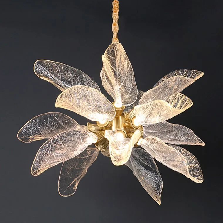 Центральным элементом каждой люстры является шарообразный латунный каркас, который обеспечивает прочность и долговечность конструкции. На этом каркасе располагаются прозрачные рассеиватели в форме листьев, выполненные из высококачественного стекла. Такая форма рассеивателей позволяет свету мягко и равномерно распространяться по всей комнате, создавая комфортную атмосферу. Люстра представлена в 5 размерах - Ø 65 × 50 см на 14 ламп, Ø 85 × 50 см на 18 ламп, Ø 105 × 60 см на 18 ламп, Ø 125 × 60 см на 22 лампы, Ø 150 × 65 см на 26 ламп. Мощность 1 источника света - 3W.