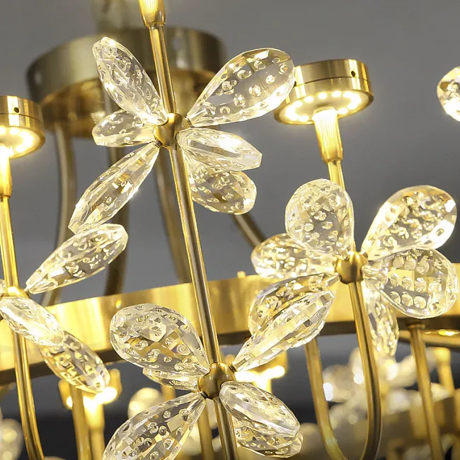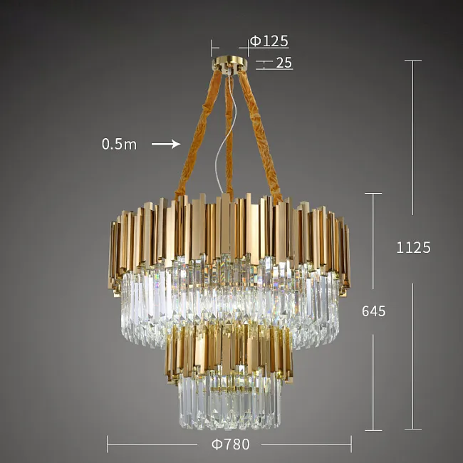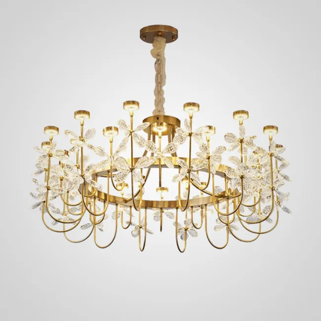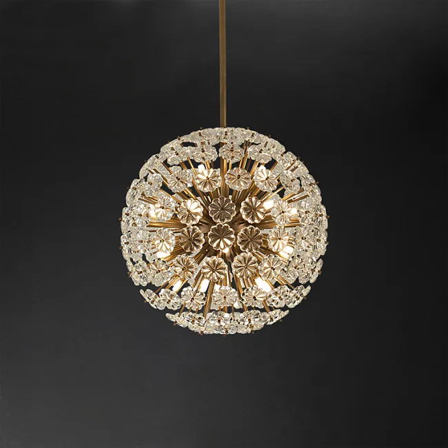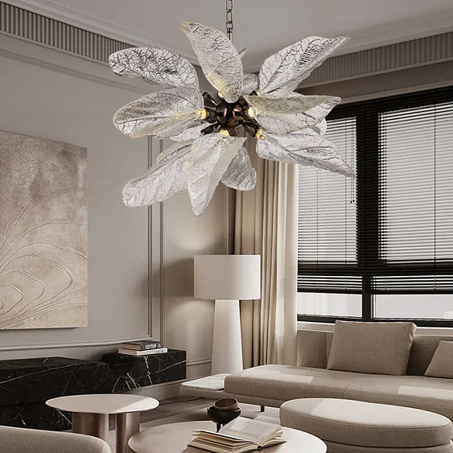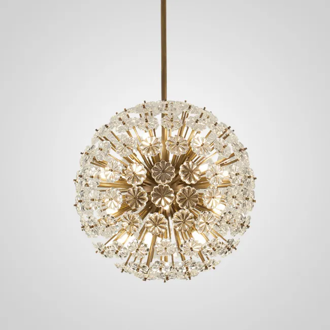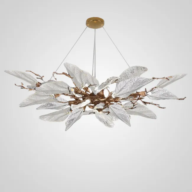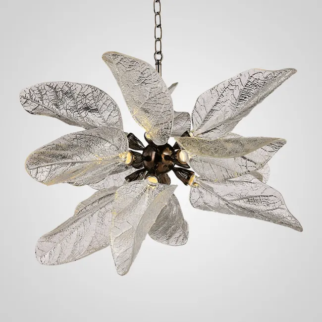 Центральным элементом каждой люстры является шарообразный латунный каркас, который обеспечивает прочность и долговечность конструкции. На этом каркасе располагаются прозрачные рассеиватели в форме листьев, выполненные из высококачественного стекла. Такая форма рассеивателей позволяет свету мягко и равномерно распространяться по всей комнате, создавая комфортную атмосферу. Люстра представлена в 5 размерах - Ø 65 × 50 см на 14 ламп, Ø 85 × 50 см на 18 ламп, Ø 105 × 60 см на 18 ламп, Ø 125 × 60 см на 22 лампы, Ø 150 × 65 см на 26 ламп. Мощность 1 источника света - 3W.