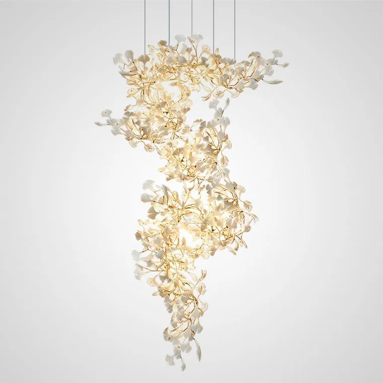 Белоснежные рассеиватели, выполненные из керамики, напоминают листья гинкго, символизирующие долголетие и мудрость. Частично листья нежно окаймлены золотистым напылением, добавляющим им блеск и элегантность. Как же прекрасно воплощено в этой люстре безупречное сочетание природного мотива с роскошью золота!