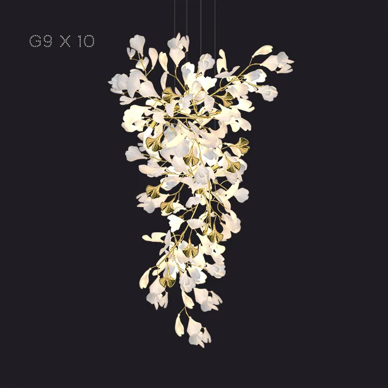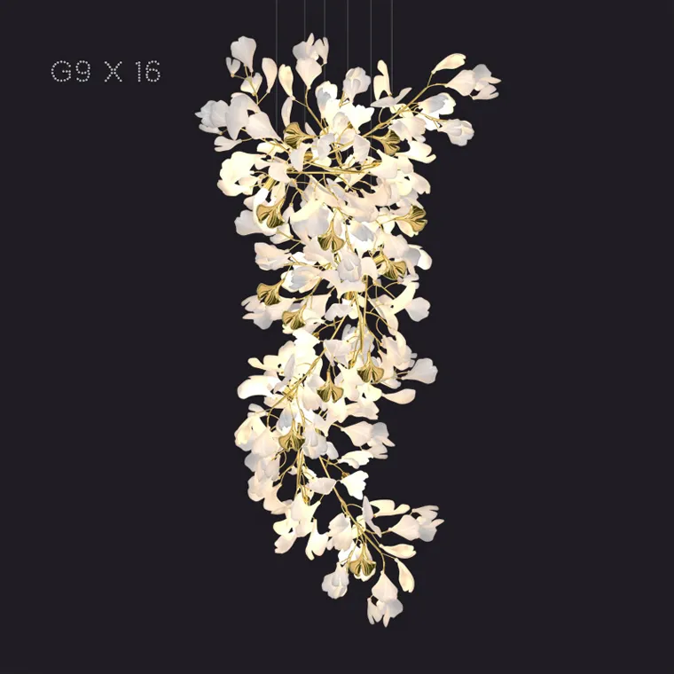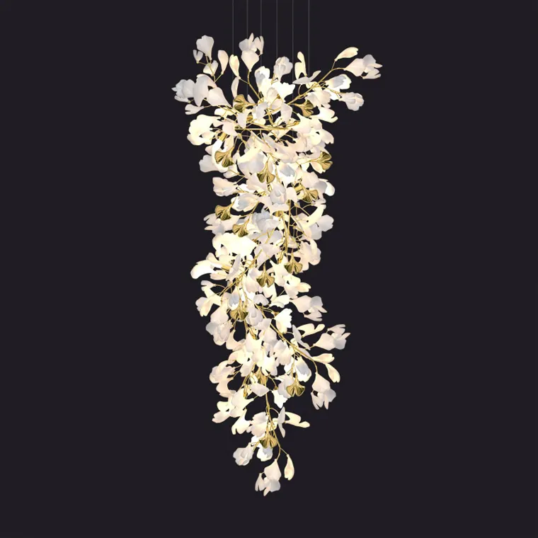 Дизайнерская люстра с белыми и золотыми рассеивателями на ветвистых рейках с природными мотивами