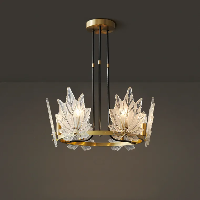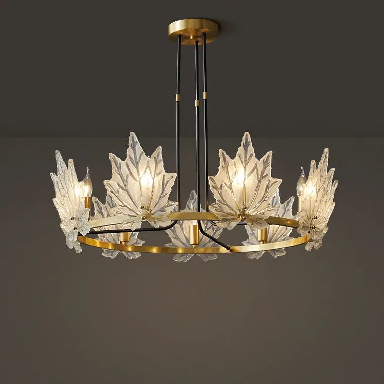 Дизайнерская серия люстр Karanda с прозрачными стеклянными плафонами в виде кленовых листов на кольцевом каркасе станет ярким акцентом в любом интерьере. У нас доступны модели с различным количеством ламп - 6 (размер Ø 55×65 см), 9 (Ø 80×65 см), 12 (Ø 100×65 см) и 18 (Ø 100×95 см).