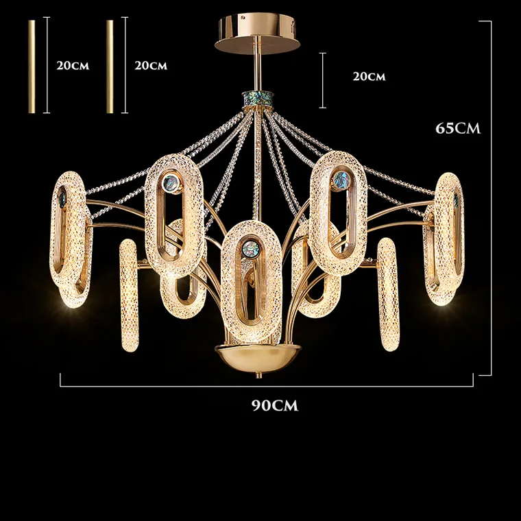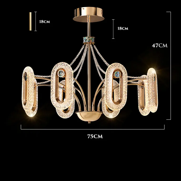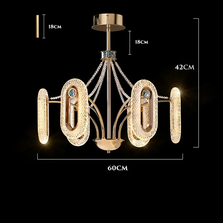 Наша серия люстр Kezia CH отличается изысканным дизайном с рельефными овальными плафонами, украшенными декоративными бусинами и перламутром. Люстры представлены в трех размерах: Ø 60×42 см (6 ламп), Ø 75×47 см (8 ламп) и Ø 90×65 см (12 ламп).