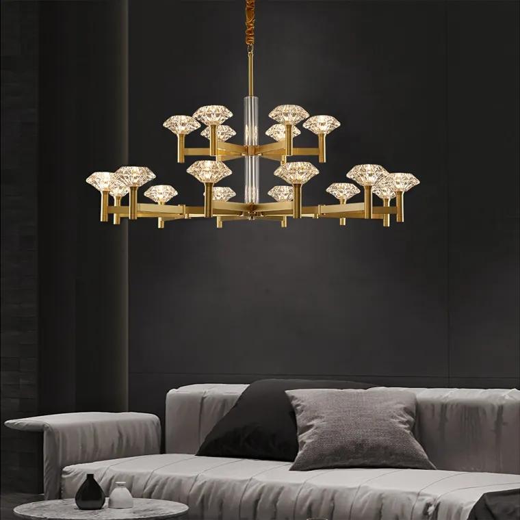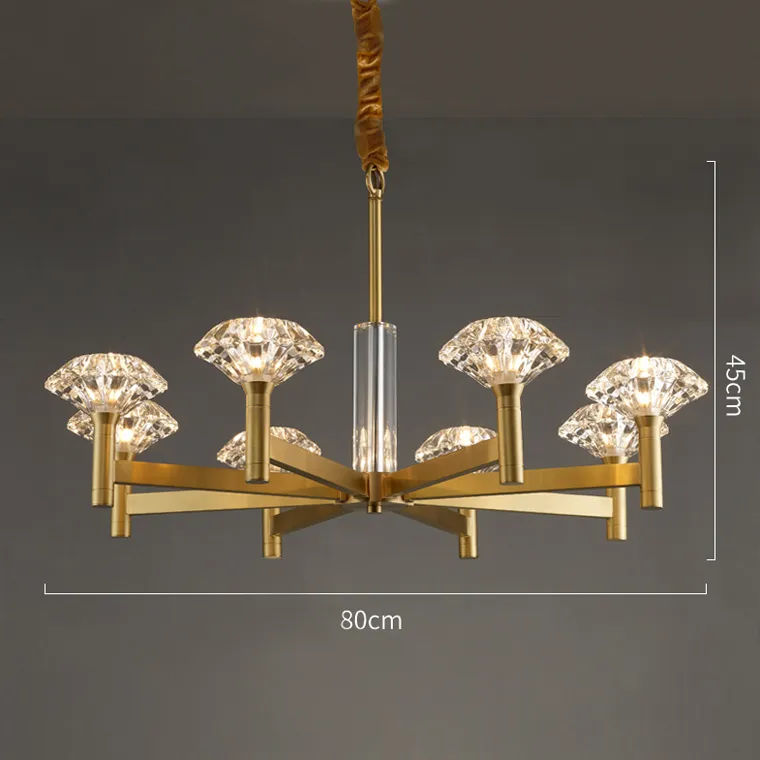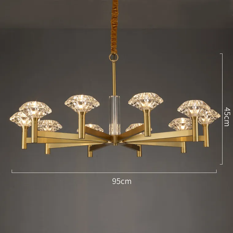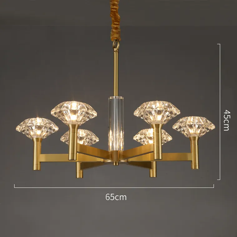 Люстра с декоративной хрустальной вставкой на корпусе и флористичными гранеными плафонами