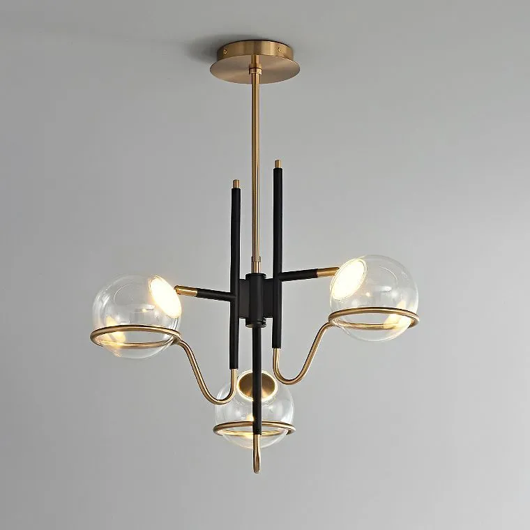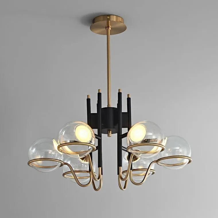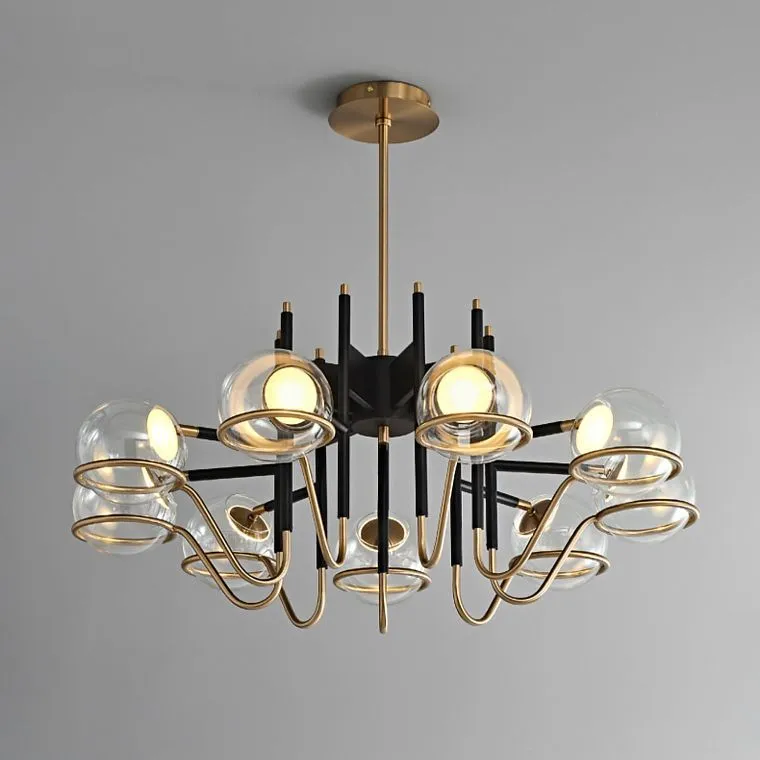 Серия современных подвесных люстр со стеклянными шарообразными плафонами, на изогнутых стойках