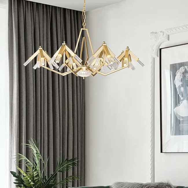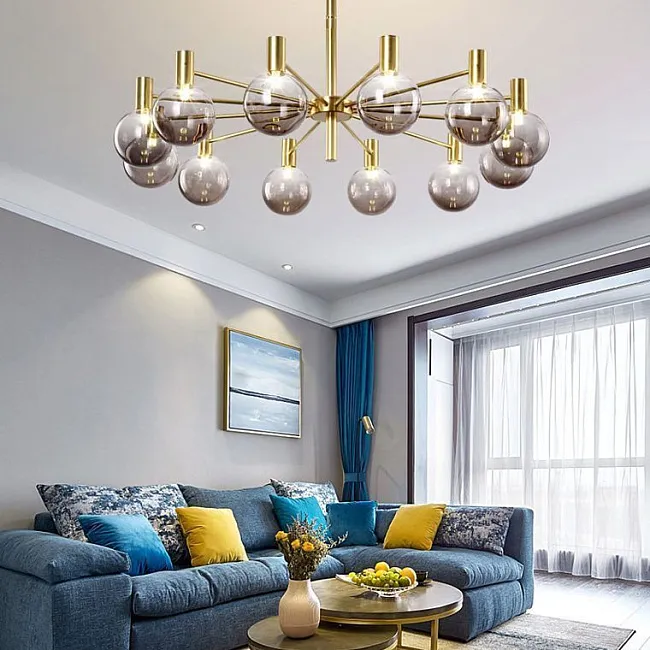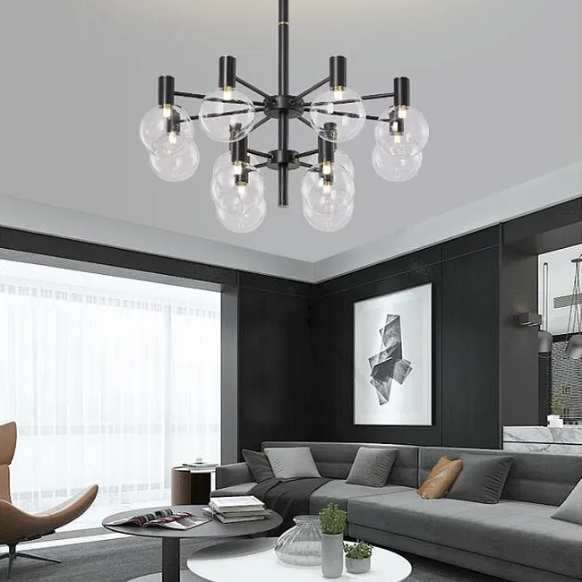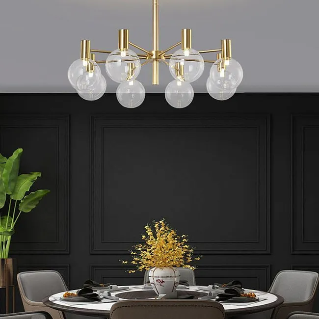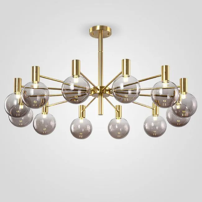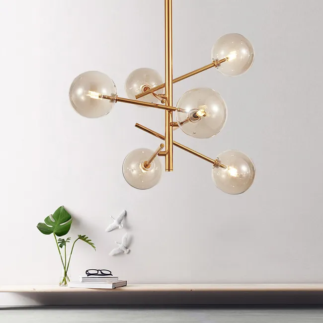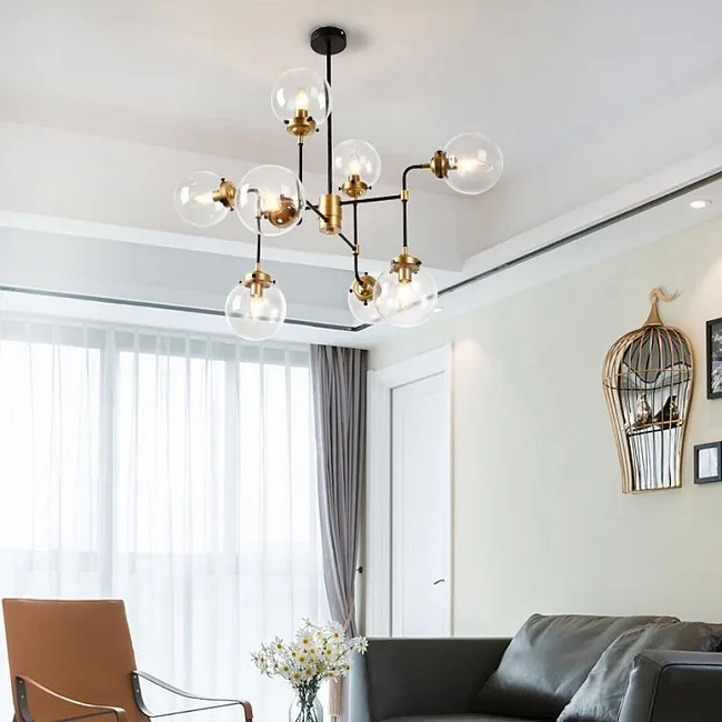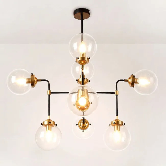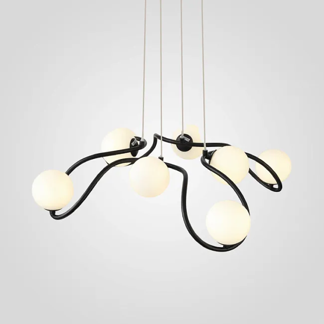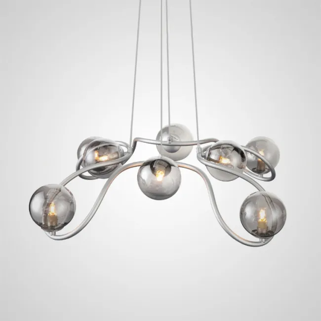 Серия современных подвесных люстр со стеклянными шарообразными плафонами, на изогнутых стойках