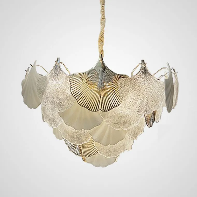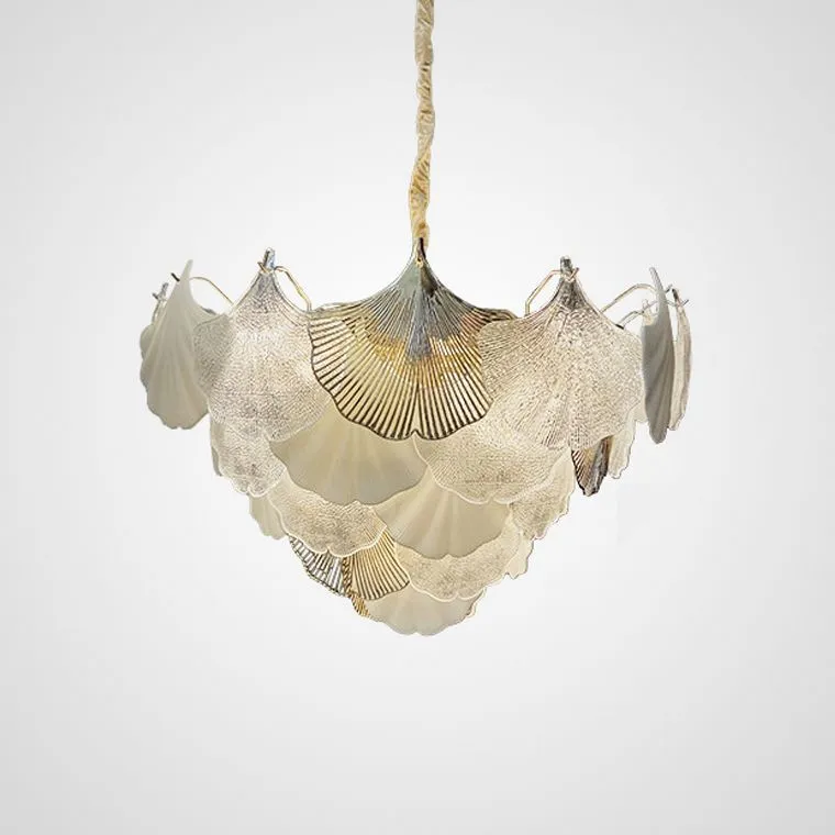 Этот нежный листопад сияет прекрасными оттенками, отображая красоту природы в самом изысканном виде. Узоры листьев гинкго, созданные из матового и прозрачного стекла, и металлических подвесок, образуют абажур многоярусной конструкции, которая наполняет пространство светом и атмосферой таинственности.